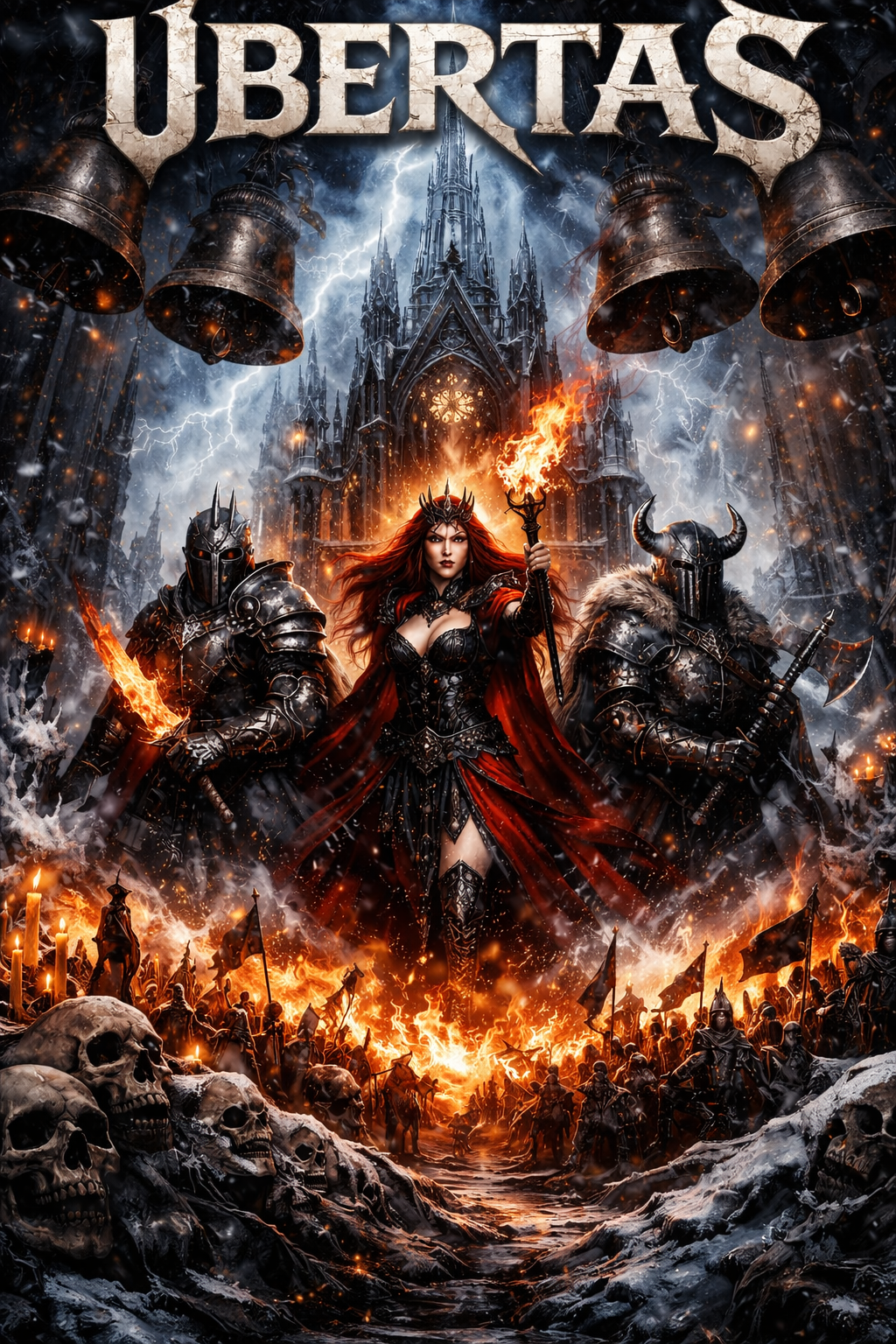 Epic symphonic metal opera, Latin lyrics, fast hypnotic ostinato inspired by Shchedryk, massive choir, operatic solos, double-kick drums, distorted guitars, bells, brass, dark winter ritual, dramatic dynamics, cathedral acoustics, cinematic scale