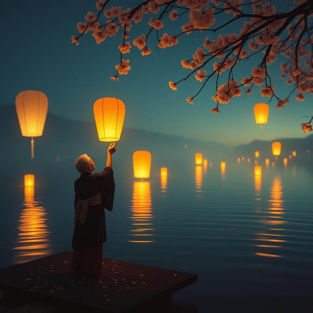 Create a contemplative Japanese ambient track with flute, taiko drums, koto strings, Tempo 65 BPM, Mood: peaceful remembrance mixed with quiet grief for what's being lost, Minimal production with space between notes, Style that meets traditional matsuri music, Lyrical theme: An elder's hands releasing lanterns, knowing this might be the last generation to remember, The weight of being the last keeper, Beautiful loneliness of holding onto fading light