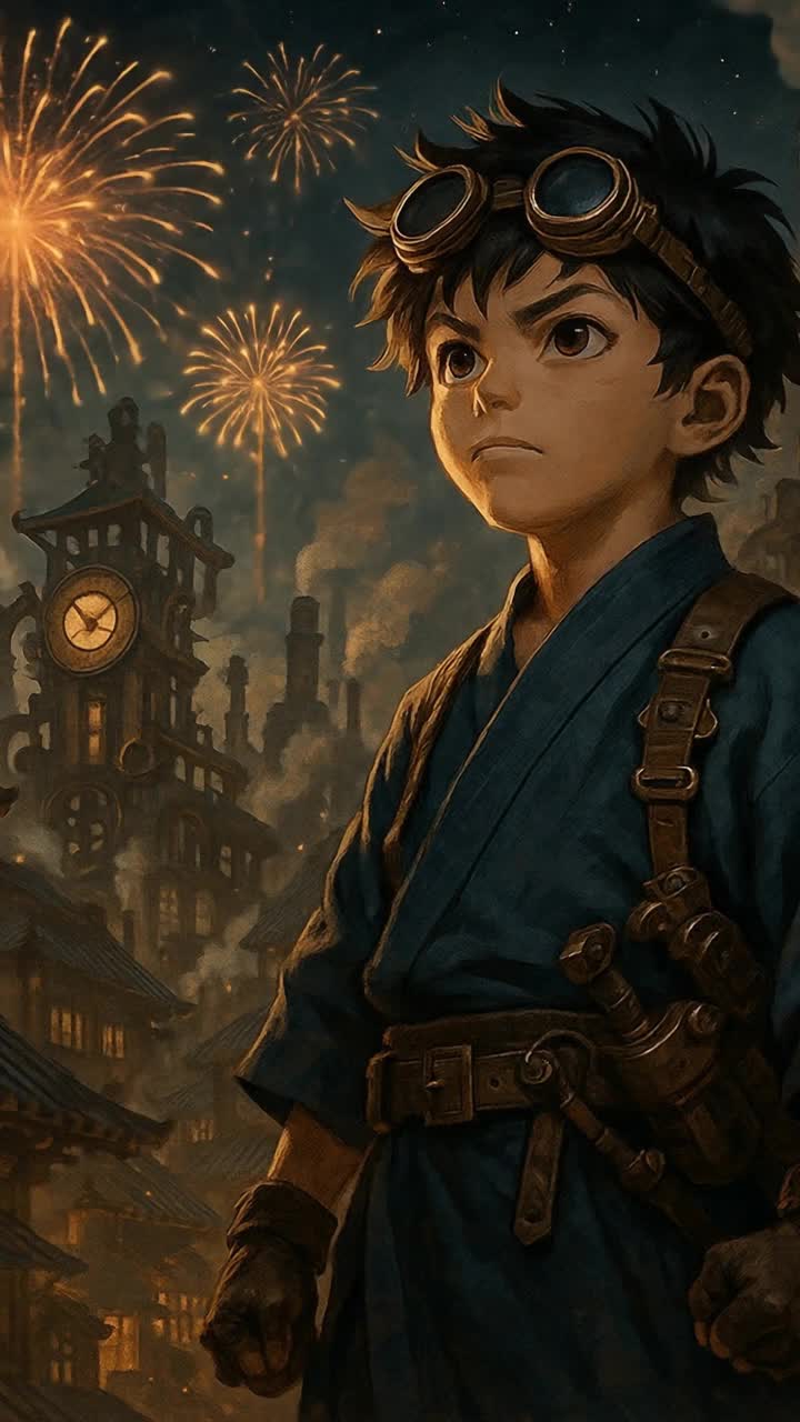 Featuring a passionate young woman lead vocal, with driving rock energy and emotional delivery, Blend electric guitars and drums with shamisen, taiko drums, and background sounds of clockwork gears, steam bursts, and metallic machinery, Mood is brave, inspiring, and dramatic—building to a powerful climax like a firework show, Tempo: Medium-fast, Style: Fusion of Japanese folk and high-energy rock with steampunk atmosphere
