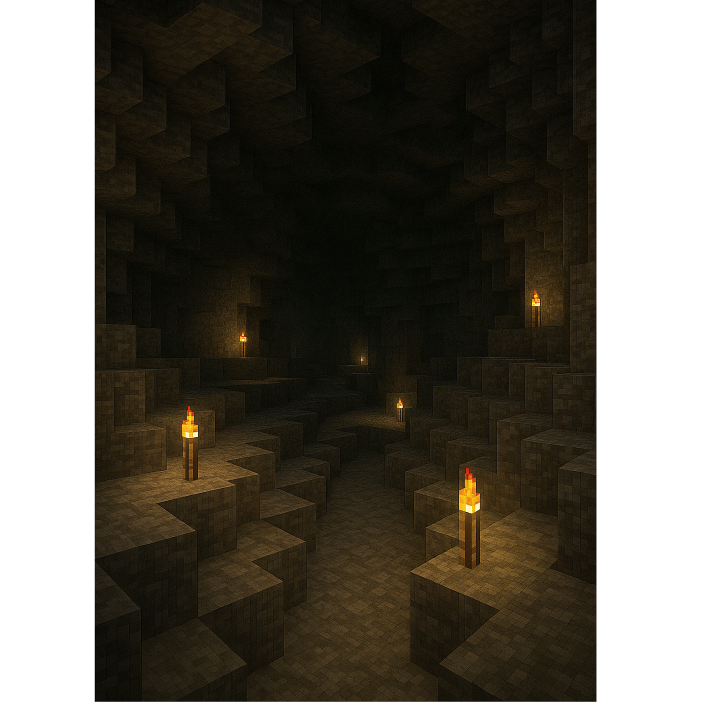 Atmospheric ambient instrumental inspired by Minecraft cave exploration, Echoing piano, deep reverb synths, distant drones, subtle metallic textures, Dark, mysterious, slightly eerie but still calm, Very slow tempo (60 BPM), No rhythm, immersive cave ambience
