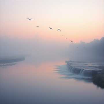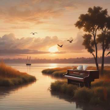 folk, Soft ambient soundscape; airy synth pads and warm piano as the bed, with light acoustic guitar arpeggios and delicate accordion phrases weaving a subtle French chanson/folk flavor, Gentle whistling lead carries the main motif, drenched in spacious reverb, Field-recorded birds, flowing water, and distant waterfalls sit wide in the stereo field for a cinematic, romantic calm, Dynamics stay tender and gradual, building slightly in the middle then easing back into a hushed, reflective close, french folk, romantic, acoustic, soft, chanson, warm, gentle, ambient, light, accordion