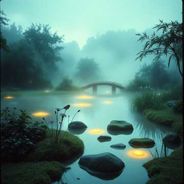 soft, ambient, jazz fusion, and soft rain sounds; gentle trumpet and piano over koto textures, slow and intimate, harp, jazz, meditation, shakuhachi, ambient jazz fusion with harp, with thunderstorm and river wave ambiance, lo-fi, gentle, meditative, slow