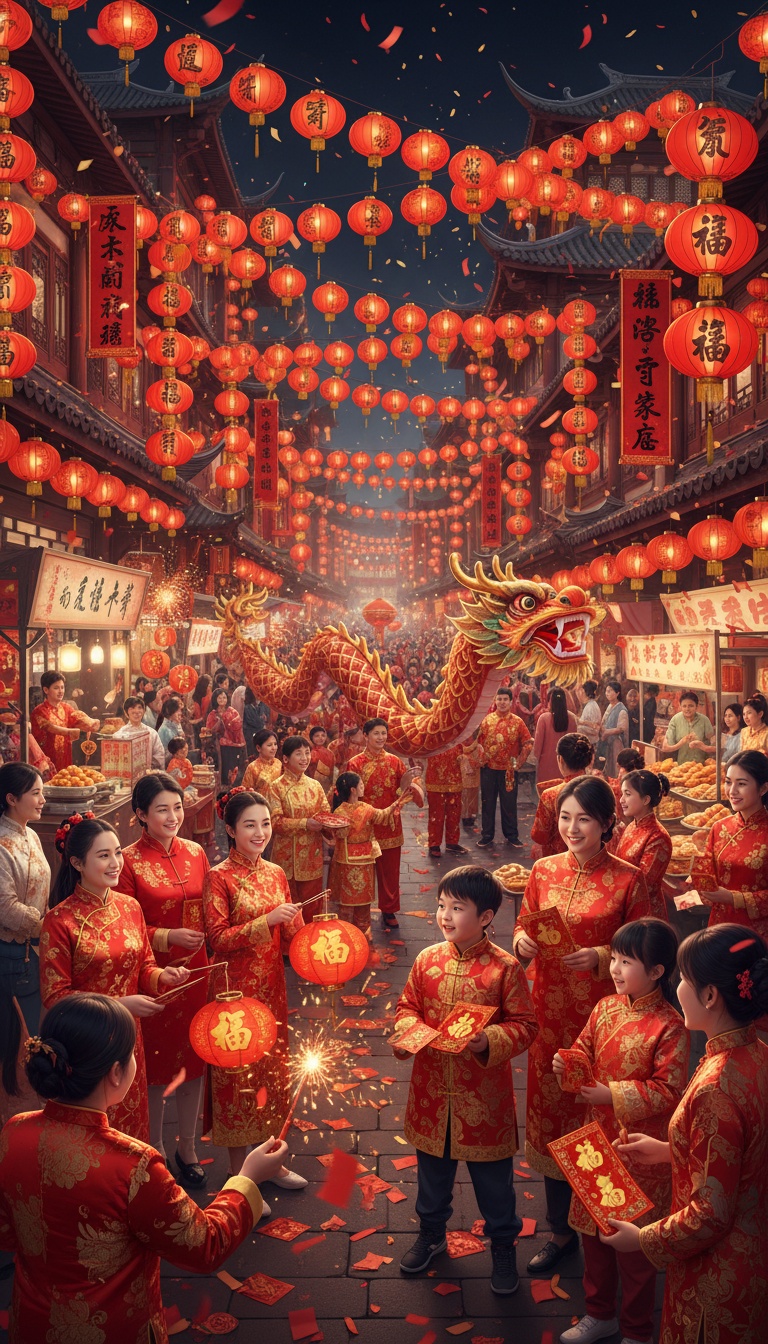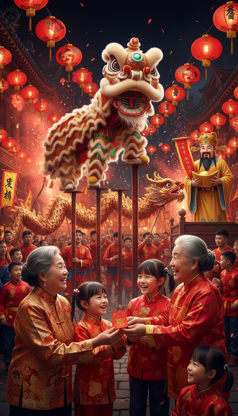 Upbeat, joyful Lunar New Year rock-fusion celebration: lively and happy festive energy bursting with prosperity vibes, Lead with guzheng's sparkling plucked runs for flowing joy + pipa's rapid strums driving rhythmic bounce; suona blasts bright, piercing highs for triumphant shouts; erhu weaves cheerful melodic lines with expressive slides, Percussion core: big da gu drums pounding heartbeat, crashing luo gongs & bo cymbals mimicking firecrackers, plus bolang gu shakes for playful fun, Light rock drums push forward momentum, symphonic strings swell in layers for grandeur, Bridge dips into zen guqin soft plucks + dizi airy flute for warm reflection, then explodes back into full festive roar, Super catchy, sing-along ready—Gong Xi Fa Cai spirit!