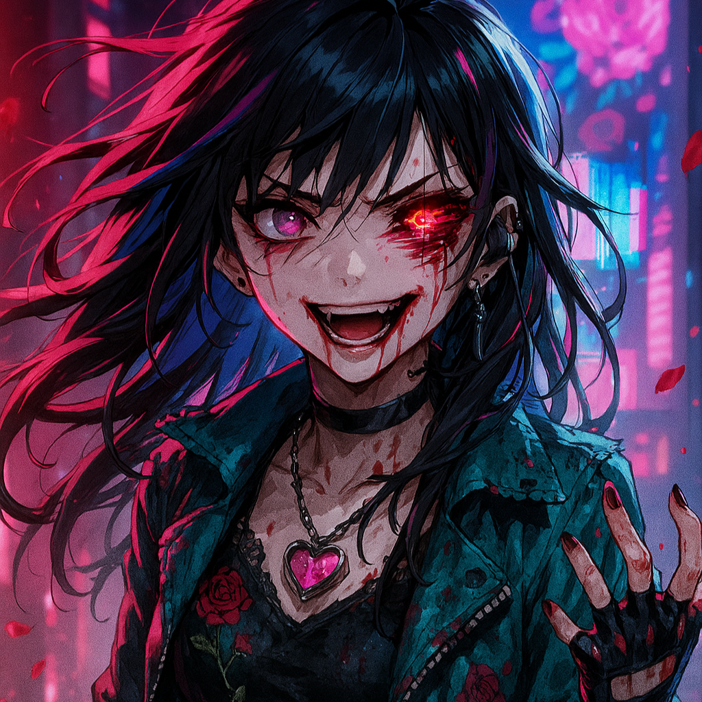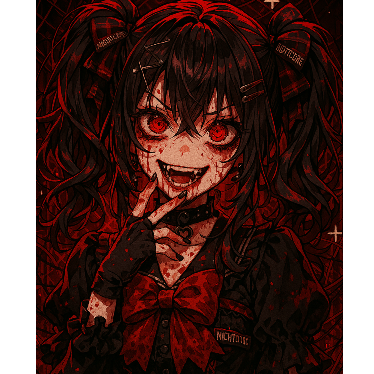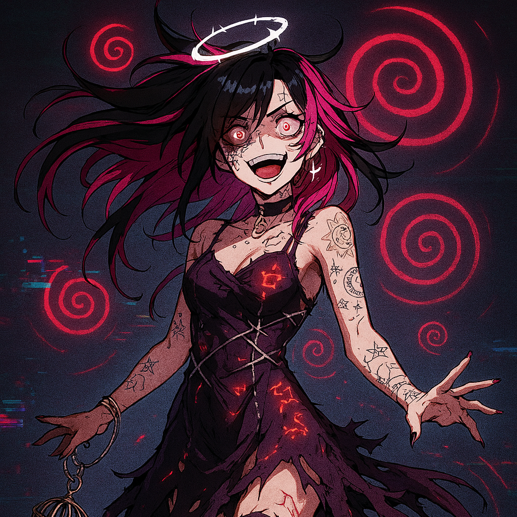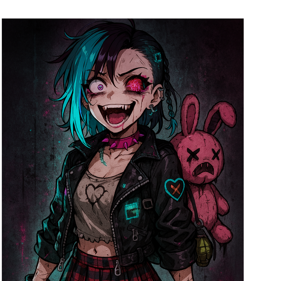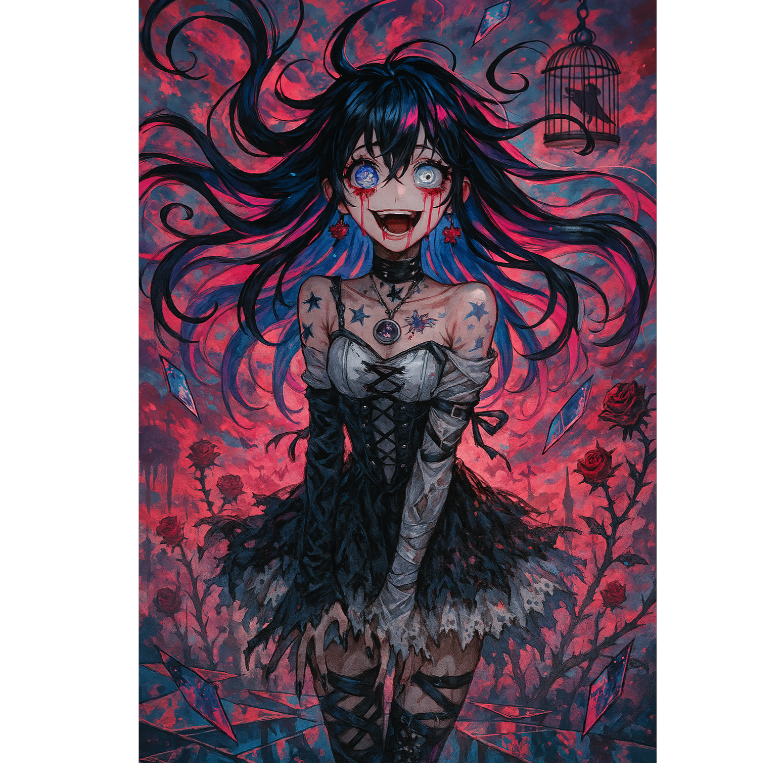 This darkwave-hyperpop fusion smolders with gritty, distorted basslines and haunting synths, Techno and trance layers build an epic atmosphere, surging into a hard trap beat drop, Sharp snares and pounding kicks drive electrifying rap female vocals with a fast, hypnotic flow, Ethereal textures swirl above intense drum and bass rhythms, adding a sense of madness, The arrangement weaves pop rock elements, an exotica flair, and terror-tinged motifs, all propelled by a carefully programmed drum machine and professional mixing for a massive, cinematic impact