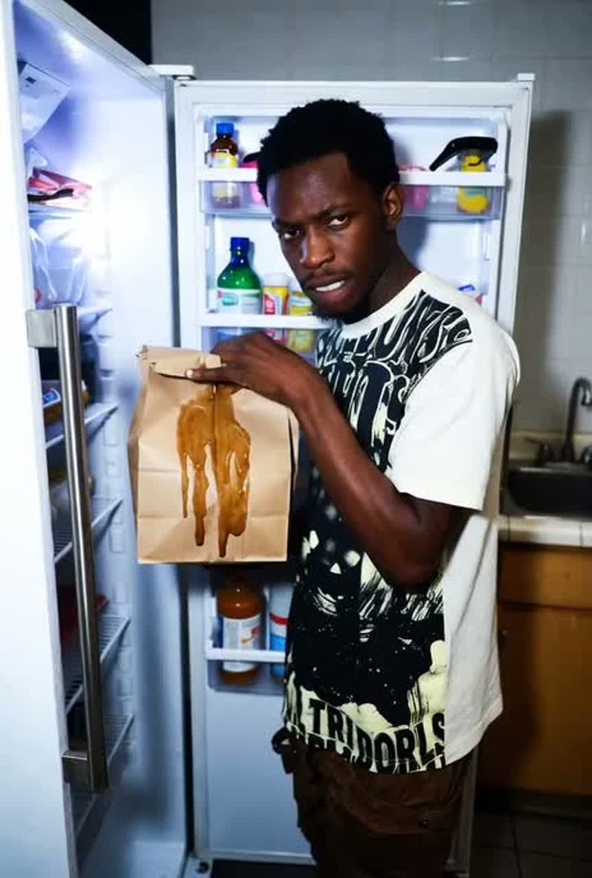 Taking a piss in the alley because he can’t hold it long enough to go to the bathroom at the bar, male vocals