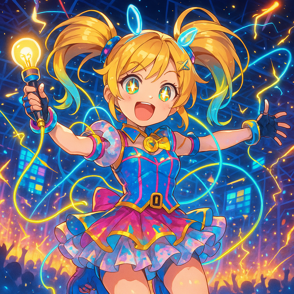 Denpa Song, hyper J-pop, electric sparkle theme, glitchy chiptune, and kawaii female vocals, Toybox percussion, synth arpeggios, and burst FX (BPM 180), 8bit and anime-style electro texture, spark-themed stabs and rhythm, Lyrics depict a magical girl who was reincarnated as a light bulb