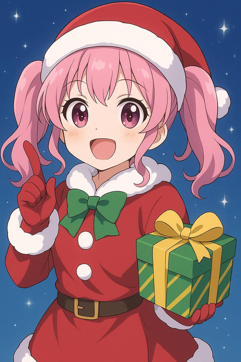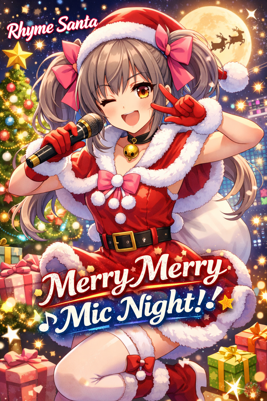 A x’mas Denpa / kawaii J-pop track with high-energy 8bit chiptune and playful electronic pop textures, bright sleigh bells, bouncy synth arpeggios, and punchy drum machine (BPM 170), Cheerful synth leads and retro gamey blips with layered angelic bells create a sparkling holiday atmosphere, Lyrics depict a bubbly, mischievous “Momo Santa” delivering joy across the galaxy — a cute crush / delivery-night story arc —