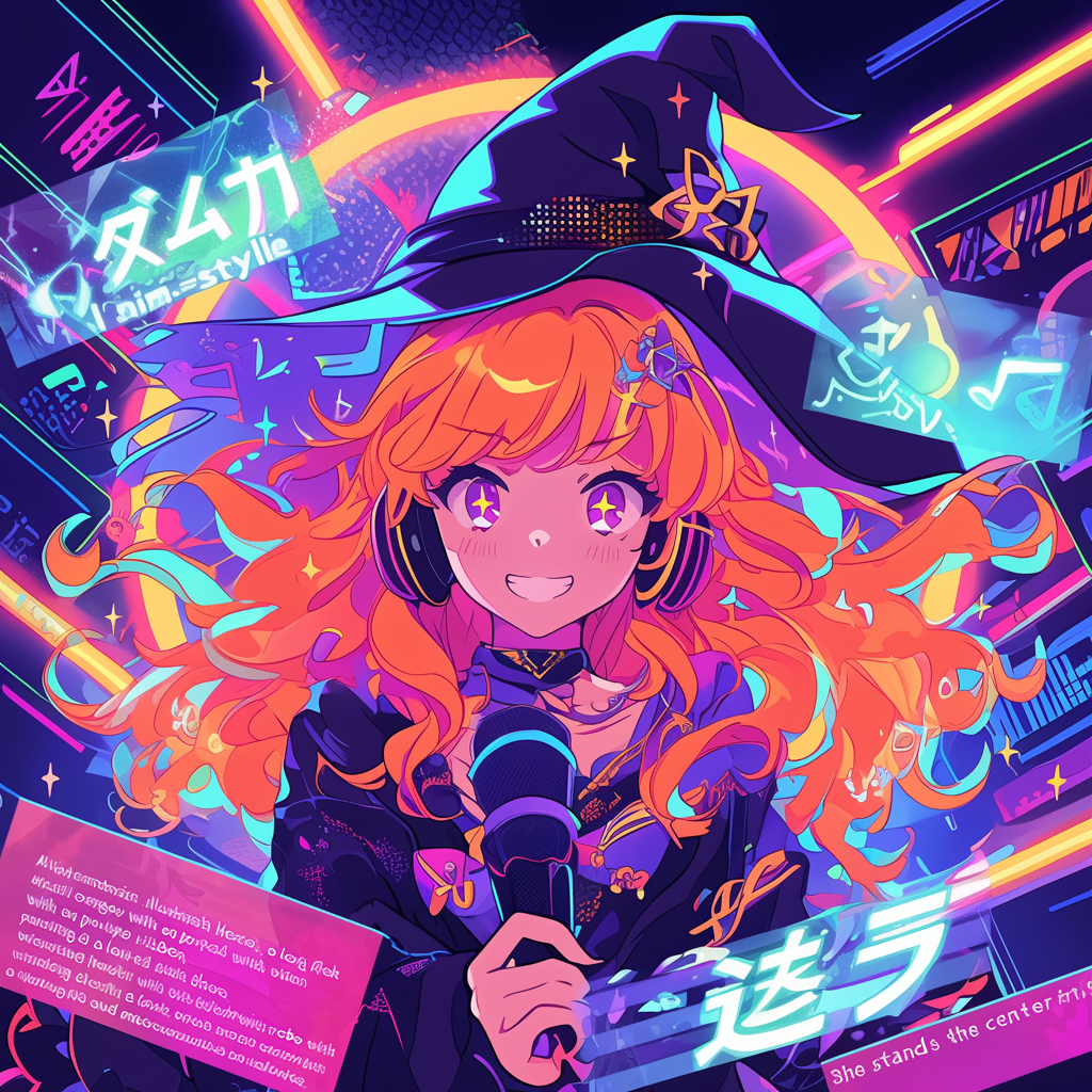 Hyper Denpa Song, ultra-fast J-pop remix, energetic karaoke theme with magical-girl flair, Twin vocal duet (female × female), 200 BPM, bright electro synths, glittering chiptune arpeggios, and distorted “pico-pico” drum fills, Explosive key changes and over-the-top emotional delivery with comedic anime-style call-and-response, Lyrics celebrate carefree fun, love, and karaoke chaos through sparkly magic imagery and dialect catchphrases (“ばいっ!” “テンアゲ!”), High-pitched kawaii tone with bouncy phrasing and exaggerated energy; auto-tuned harmonies swirl into a final “Love Beam” climax