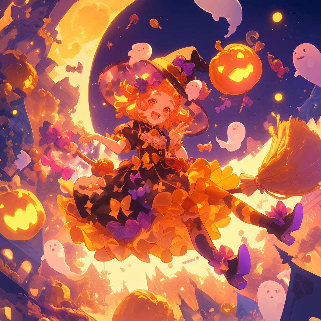 hallows, denpa song, Cute, energetic Halloween J-pop song featuring a clumsy apprentice witch named “Pumpko-chan”, Cheerful female vocal, kawaii chorus, playful chants and sound effects (like “Ponpoko ponpon” and “Wasshoi!”), Genre: Happy J-pop / Halloween kids anime style