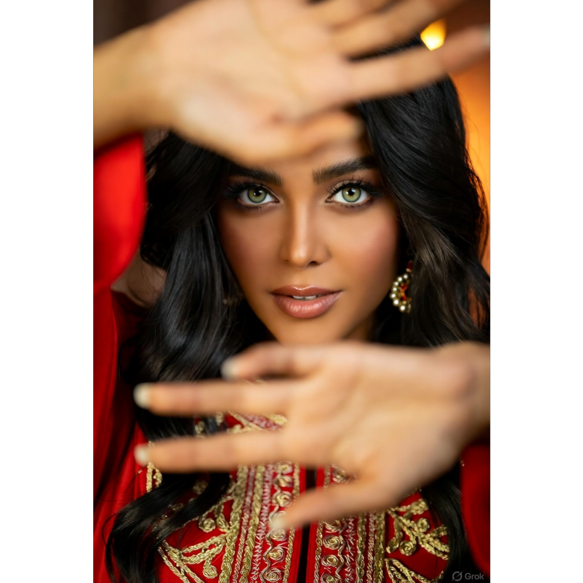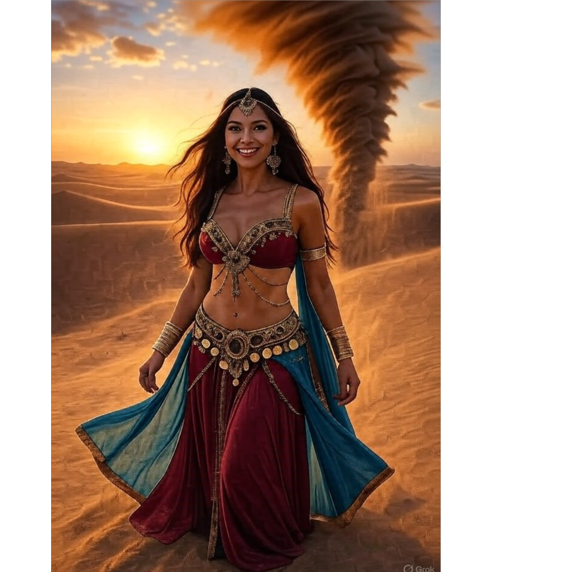 A hypnotic fusion of Arabic dance rhythms, deep bass, trance energy, and cinematic ambience, Mystical belly-dance groove with oud, darbuka, and shimmering synths, Breathy female vocals blend poetic storytelling with percussive chant hooks, mixing ancient desert mysticism and modern EDM drive, Amber dusk on satin skin, veils of fire, shadows spin we are the rhythm, we are the flame