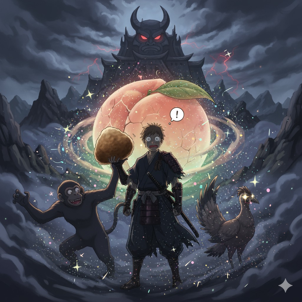 Bilingual comedy J-pop song (Japanese and English), Humorous retelling of Momotaro’s story with witty commentary, Upbeat tempo, shamisen, shakuhachi, and taiko drums mixed with modern pop beat, Male and female alternating vocals, Include spoken English narration for jokes, cheerful energy, and catchy chorus