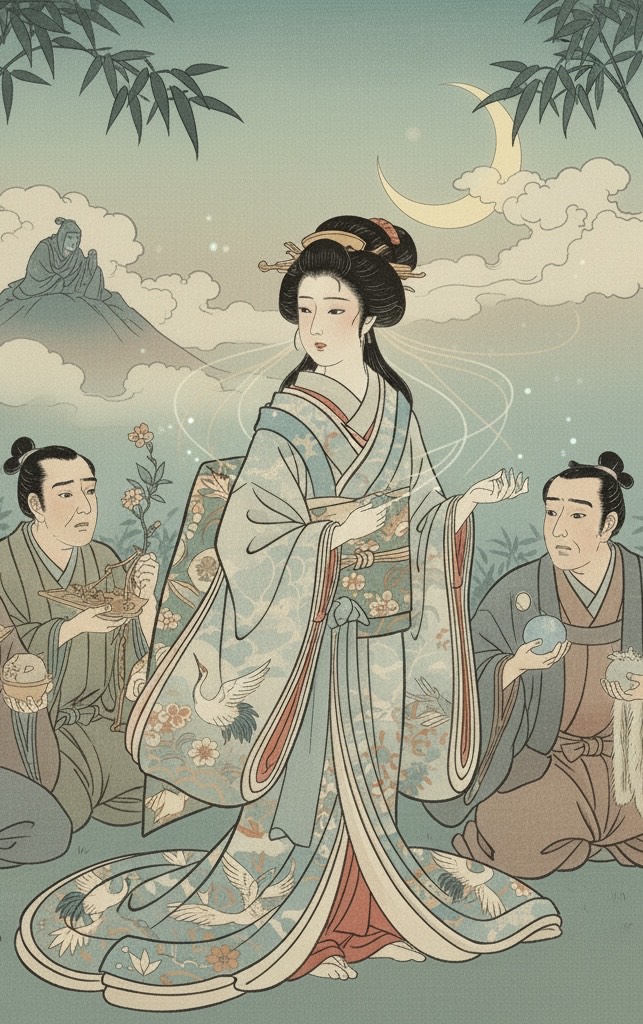 A high-speed bilingual storytelling song retelling The Tale of Princess Kaguya, Performed as a dynamic dialogue between: