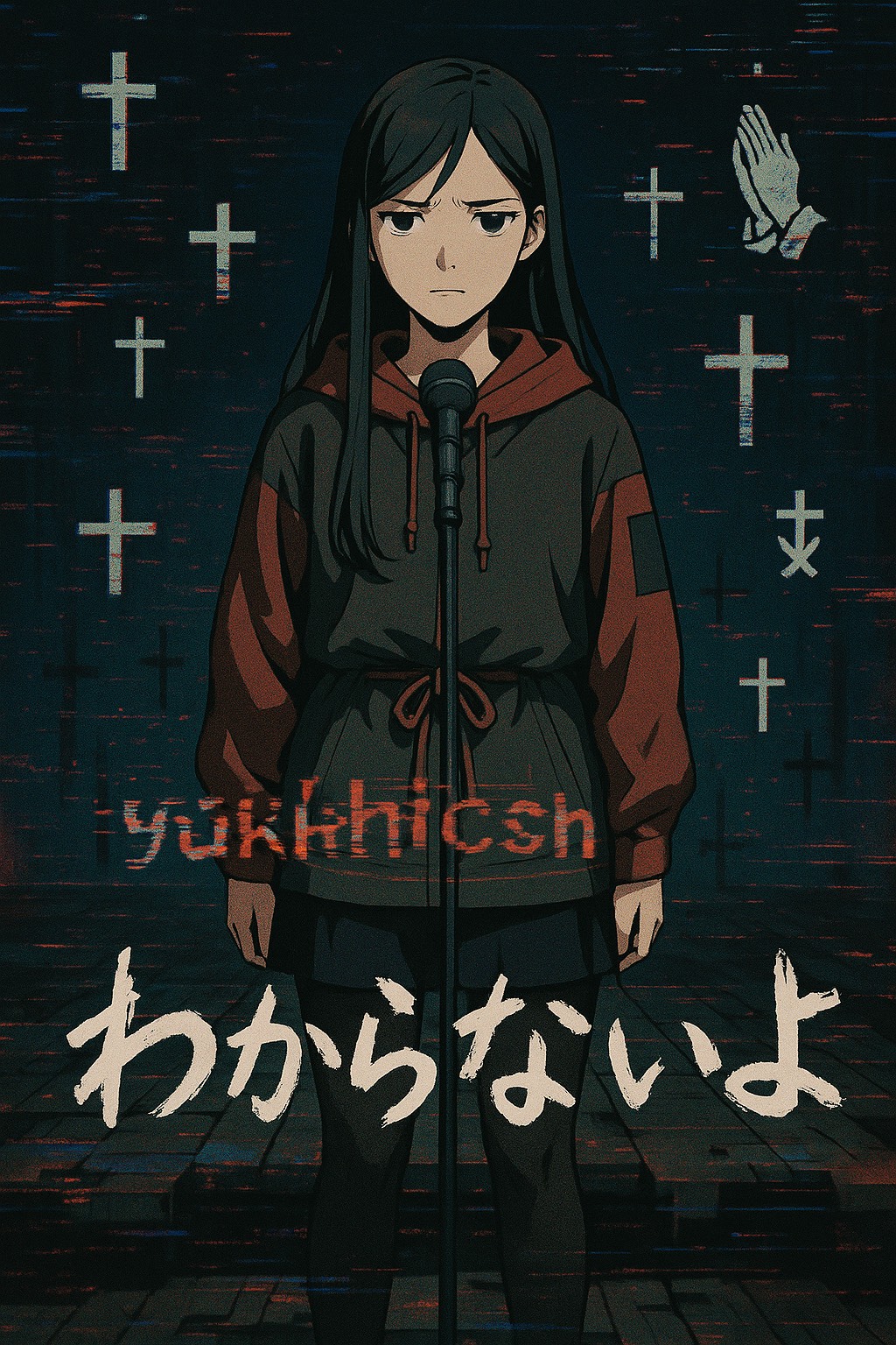 Melancholy industrial rock track with distorted Vocaloid vocals; combines gritty guitar riffs, mechanical percussion, and glitchy synth layers with a sorrowful, hollow tone, Vocals are processed, metallic, and emotional; screamed in pain, whispered in defeat, and layered with static as if recorded in a broken machine, Drum patterns are rigid and metallic, evoking factory noise and emotional numbness, Verse sections feature eerie ambient pads and minor-key synths, with vocal lines that sound emotionally suppressed or corrupted, The chorus explodes into distorted guitars and pounding drums but carries a tragic melody underneath the chaos, Glitch effects, bitcrushing, and reversed samples simulate psychological breakdown, The song feels like a soul breaking inside a machine—violent, desperate, but full of aching vulnerability, Themes: self-disgust, internal decay, emotional suffocation