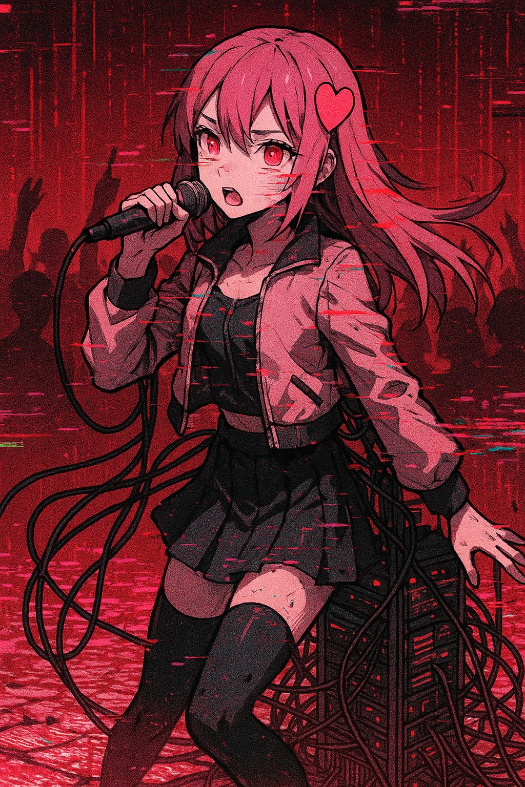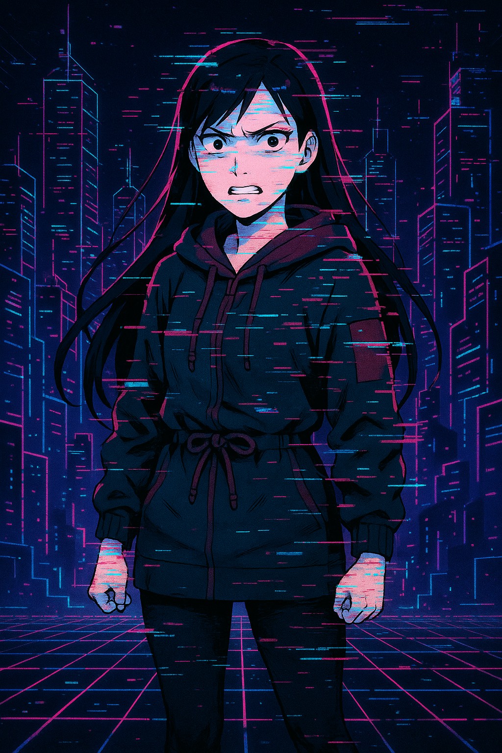 Aggressive, high-intensity metal track with chaotic, panic-driven energy, Vocaloid vocals are sharp, frantic, and unsettling—screamed and layered with glitchy, distorted effects that cut through the mix like shattered glass, Guitars are tuned low and heavily distorted, churning out fast, dissonant riffs with sudden, jarring stops, Drums are relentless, with rapid double-kick patterns, blast beats, and syncopated fills that create a sense of unease, Bass is deep, grinding, and mechanical, pushing the low end to near-breaking point, Include industrial noise, glitch effects, and haunting, synthetic soundscapes for a claustrophobic, nightmarish feel, Feral, intense, and fear-inducing, Emphasize chaotic energy, rapid dynamic shifts, and a tone that feels like a digital horror unraveling in real time, Production should be sharp, aggressive, and overwhelming, leaving the listener breathless