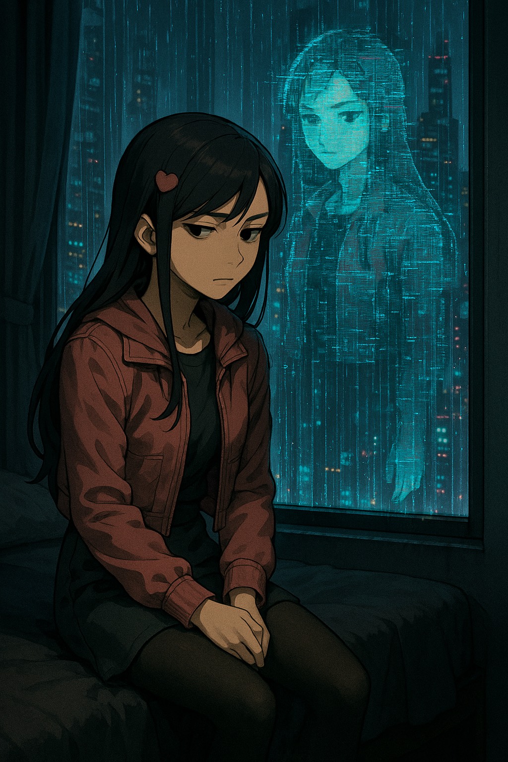 Vocaloid metal track with a ghostly, unsettling atmosphere, Vocals are distorted and distant—like screams echoing from another realm—layered with glitchy effects and whispered harmonies, Guitars are sharp and dissonant, with rapid, palm-muted riffs and eerie tremolo leads soaked in reverb, Drums are relentless and jagged; blast beats and stuttering rhythms drive the chaos, Add haunting synth textures, reversed sounds, and ambient noise—creaking wood, static, ghostly breaths, Transitions are sudden and jarring, evoking panic and possession, The tone is cold, decayed, and oppressive—Vocaloid delivery feels like a spirit forced through corrupted code, Emphasize broken beauty and spectral rage; a sonic exorcism where industrial violence meets supernatural despair, Production should feel glitchy, decayed, and unearthly—like metal channeled through a cursed machine