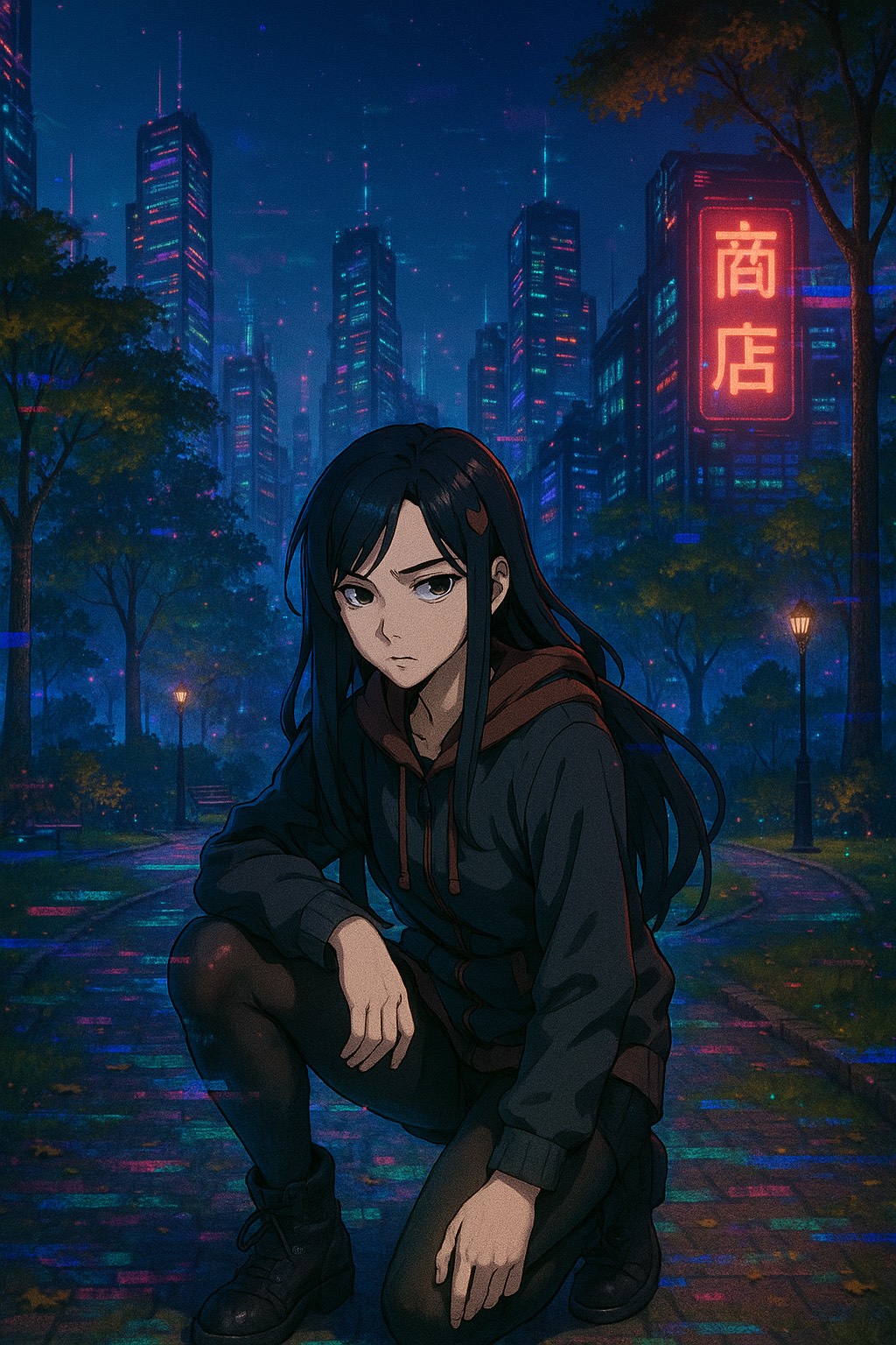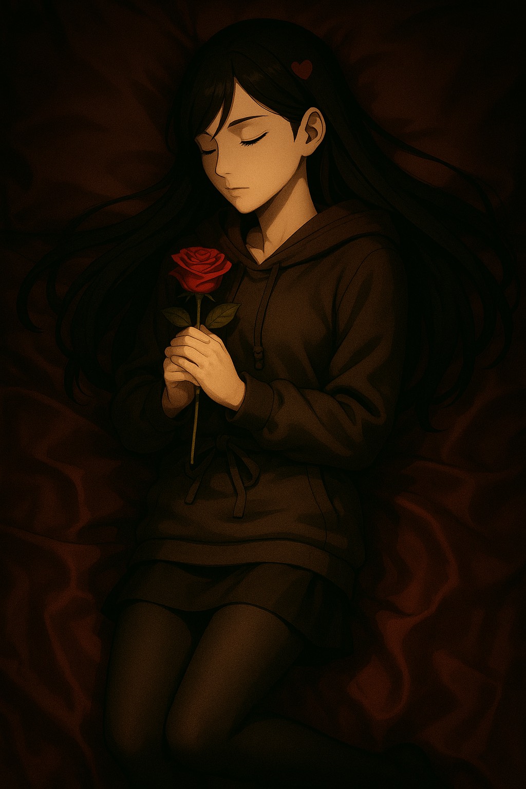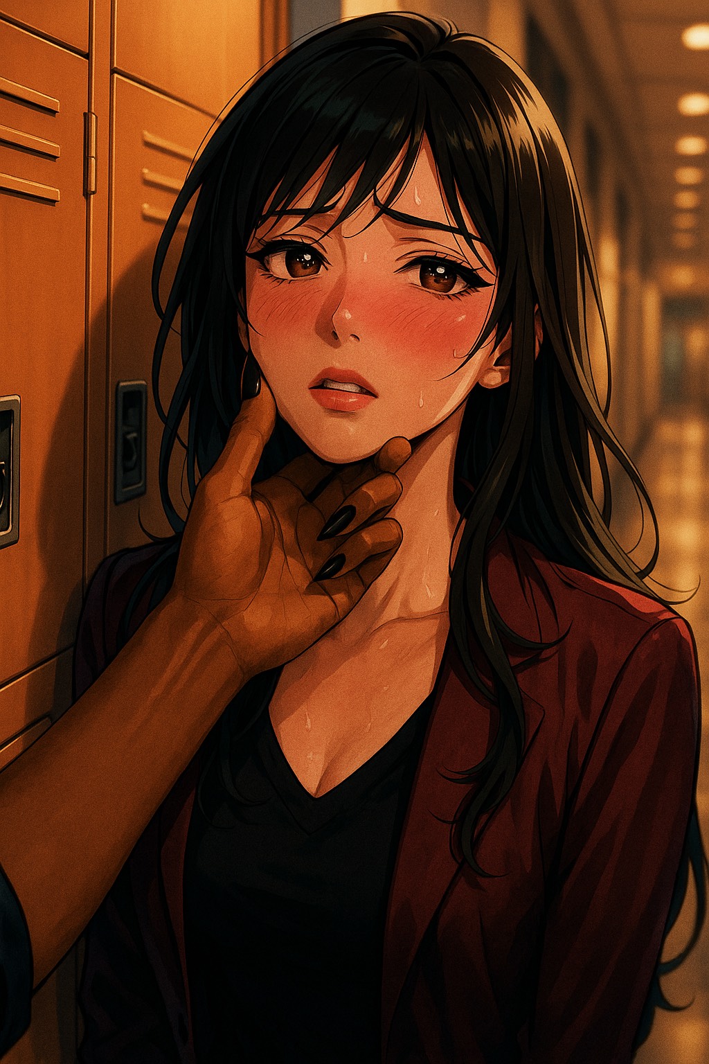 Vocaloid-driven metal track with a dark, seductive atmosphere, Vocals are sultry, smooth, and sly, layered with breathy harmonies and glitchy inflections, Tempos shift between slow, hypnotic grooves and sudden bursts of metallic aggression, Guitars are distorted and gritty, but groove-heavy; riffs pulse like a heartbeat beneath velvet synth textures, Include industrial elements, clicks, whispers, metallic creaks, for a tense, sensual soundscape, Bass is thick and slow-moving; drums are sharp and precise, with syncopated rhythms that build suspense, Emphasize control, temptation, and danger; a sound that feels like being drawn into something forbidden, Production should be sleek and immersive; a velvet-draped nightmare with steel beneath, intensity but reframed as a seductive descent; manipulative, intoxicating, and beautiful in its corruption