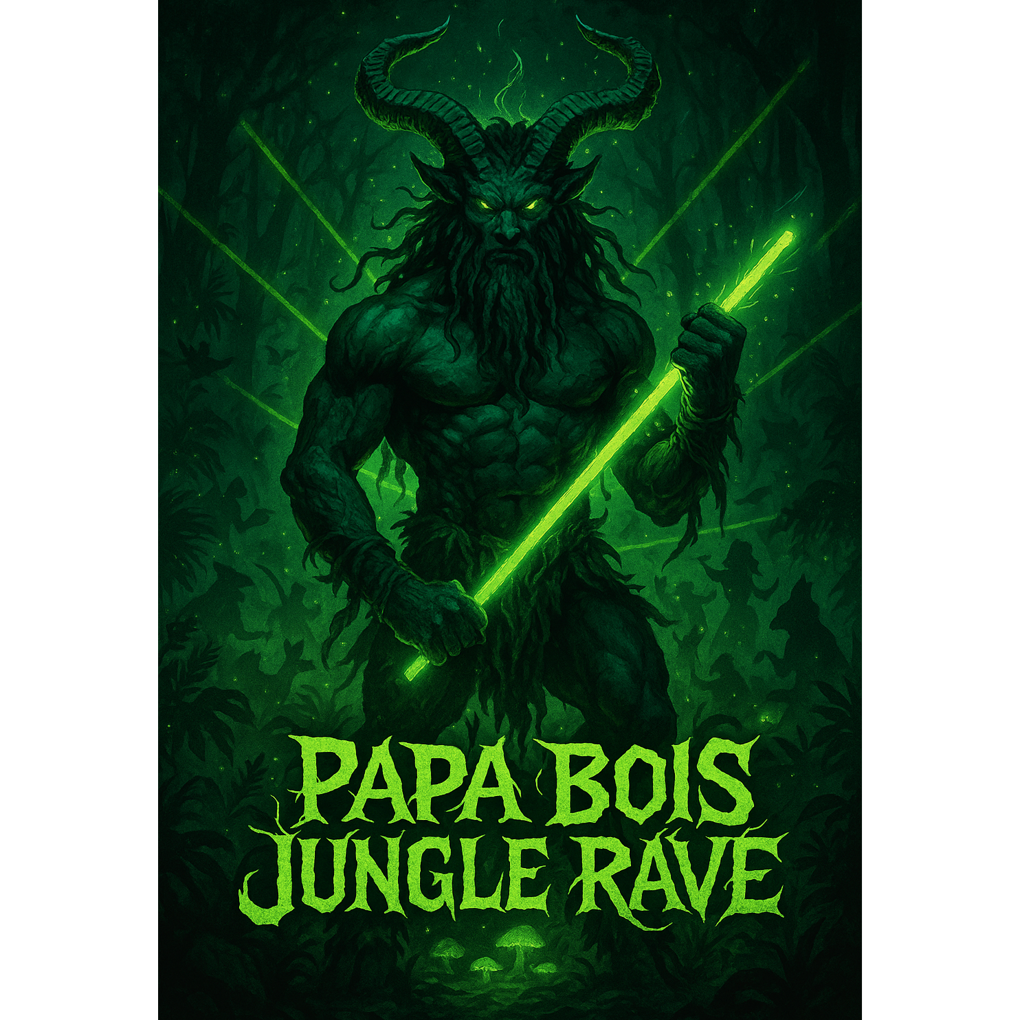 Synthwave Metal, demonic guitar riffs, fast drumming, Trancecore, Metalcore, Electronicore, Cyberpunk EDM, Hardstyle Breakdowns, Aggressive Drop, Party Ravecore, Orchestral Hits, Industrial Bass, mid-to-fast tempo, patois reggae vocals (verse), screaming vocals (chorus), tribal percussion, heavy sub-bass, jungle ambient FX (birds, insects, animals), bright trance synths, humorous wild party vibe, ritual build ups and drops