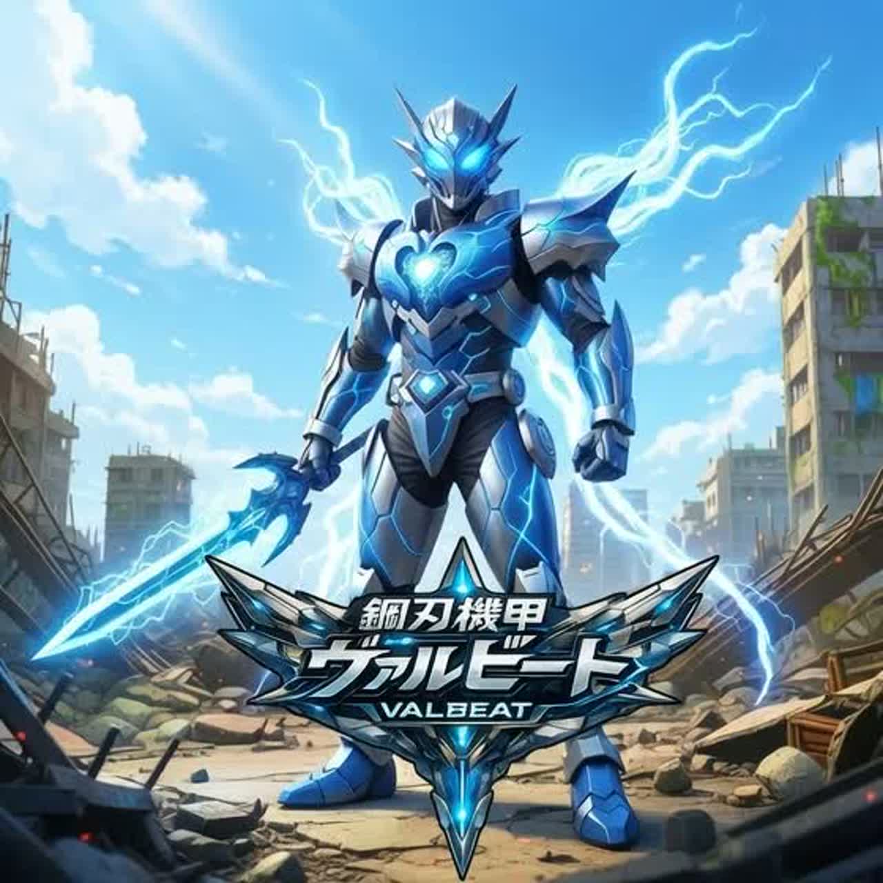 Rock, Japanese heroic rock, tokusatsu theme, cyber battle, male vocal, energetic, electric guitar, synth rock, high tempo, anime opening, cinematic intro, intense chorus, digital percussion, dramatic, epic energy, futuristic city, mecha, powerful male voice, emotional chorus, 2000s anime rock, metal edge, cyberpunk, acceleration, sci-fi theme, electronic guitar solo