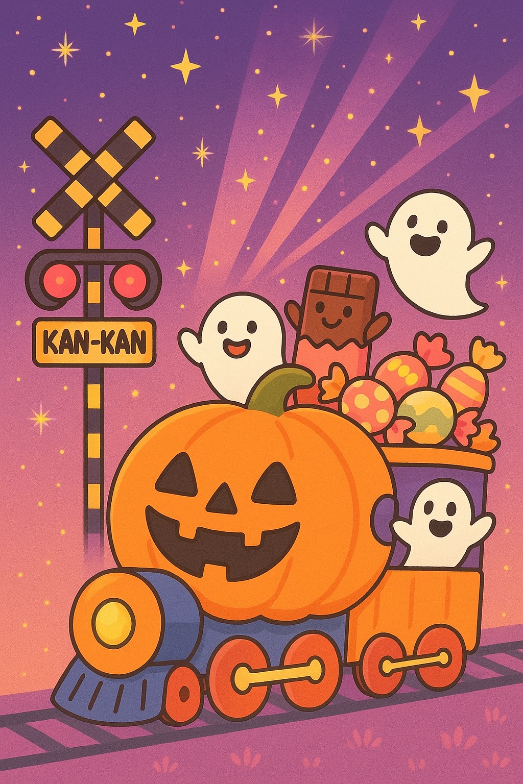 Kids Halloween disco dance song, 120–124 BPM, funky bassline, groovy guitar, bright synths, and clapping beat, Playful female vocal with cheerful and catchy melody, Add sparkly toy-like bells and glockenspiel for cute magical touches, Strong sound effects: ghostly ‘woo!’ and ‘boo!’ at intro and chorus, kids laughter after fun lines, train whistle ‘poo!’ at departures, and clear railroad crossing bell ‘kan-kan-kan’ before the bridge, Fun, energetic, and colorful disco party vibe for children