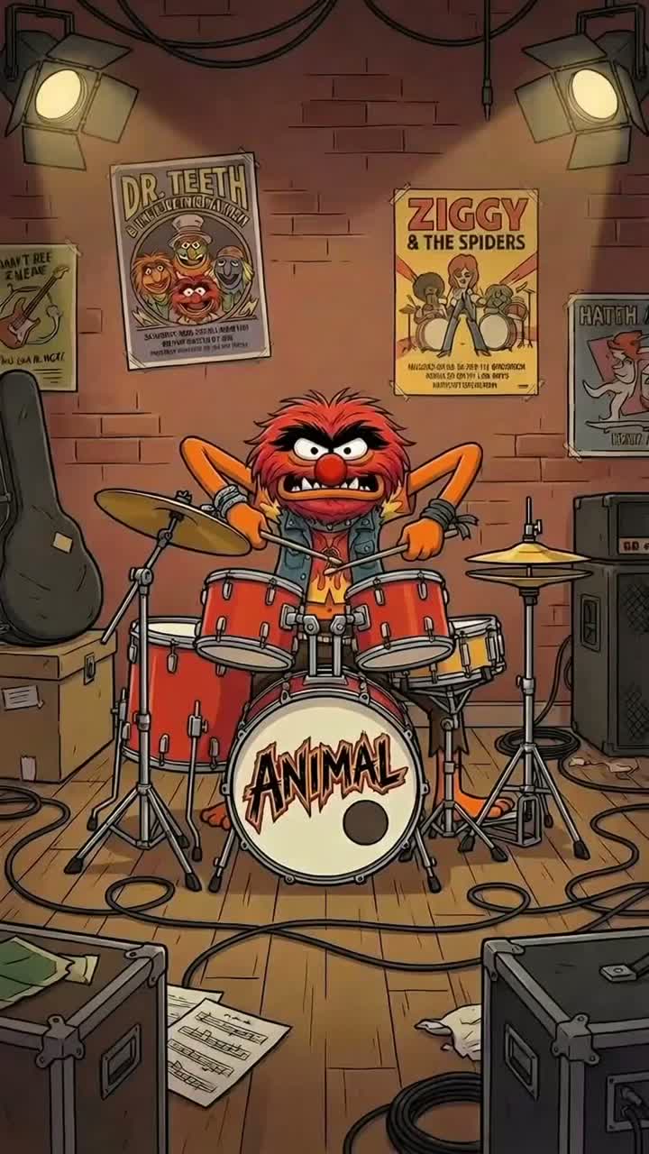 Animated TV novelty track that plays like a chaotic moment inside an episode, Music is driven by exaggerated drum kit percussion, not a live band feel, A large drum kit leads the track (kick, snare, rack toms, floor tom, crash cymbals, occasional cowbell), Playing is bold, tom-heavy, and cartoonishly exaggerated, The song features a dedicated instrumental drum break led entirely by the drum kit, The break is chaotic and character-driven, built from rolling tom fills and sudden accents, with percussion only and no melodic instruments, Lead vocal is a feral, percussive character performance rather than melodic singing, Delivery uses short, explosive shouted bursts that function like additional drum hits, with raw raspy tone, loose pitch, and strong staccato attacks reacting directly to the drums, Additional voices appear briefly as spoken character reactions, one at a time like dialogue in a scene