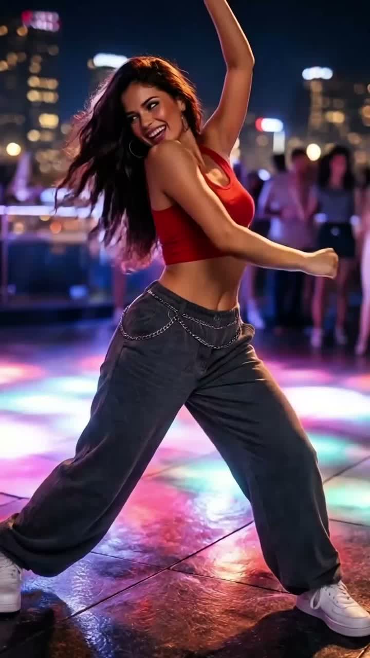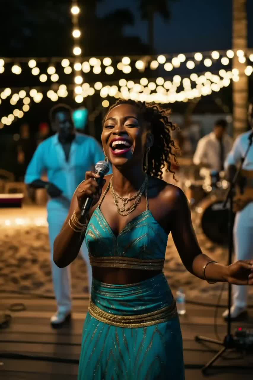 Glossy Funk-Pop-Soca crossover, Four-on-the-floor kick, disco hi-hats, live congas, synth bass and brass stabs, Female mezzo lead with playful grit; harmony stacks and crowd echoes, Bright club mix with pulsing low end, stereo shimmer, and a midnight-city energy that still feels tropical, ‑EDM drops or synth leads robotic or autotuned vocals symmetrical pop phrasing electronic snares or 808s canned crowd loops polished studio pop texture
