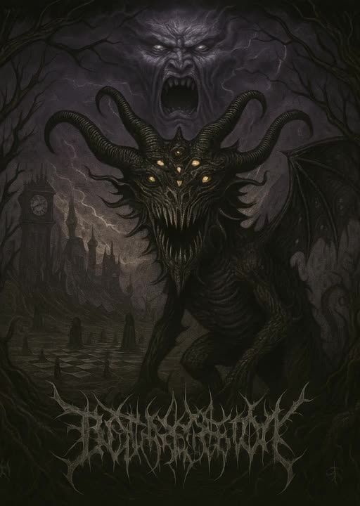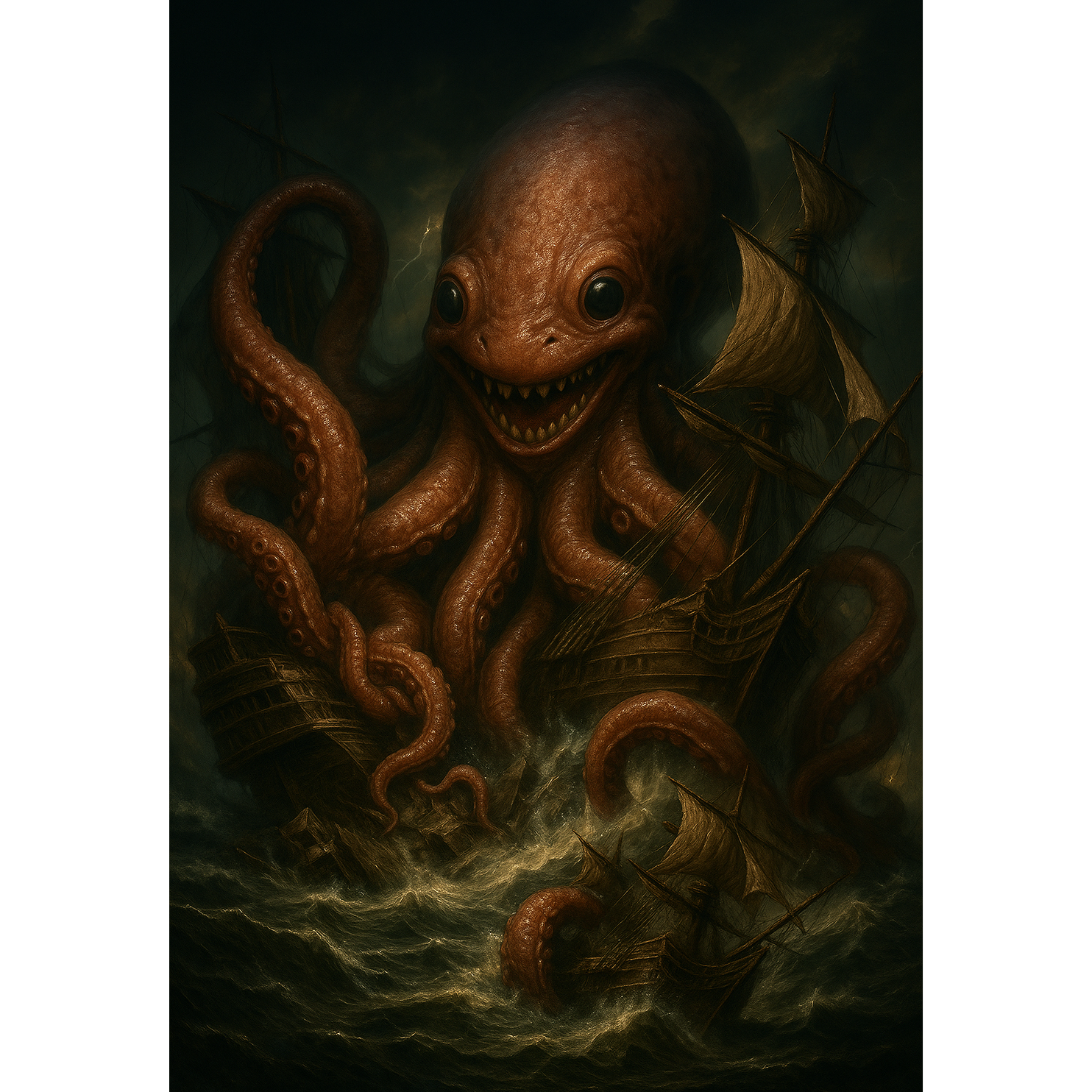Cinematic Heavy Doom Metal x Thrash fusion song about Poseidon singing a darkly cute lullaby to his pet Kraken, Thick, crushing soundscapes with crawling Doom riffs, downtuned distorted guitars, sludgy bass, cathedral-like organ drones, thunderous drums, sudden Thrash bursts with double-kick drums and tremolo riffing, Baritone operatic male lead vocal, affectionate yet ominous delivery, lyrics sound innocent and cute like a children’s song but interpreted through a heavy apocalyptic arrangement, Occasional choral backing on the final chorus for bombastic grandeur, Under 5 minutes with clear verse–chorus–bridge structure, Atmospheric ocean FX (waves, bells, thunder) in intro and outro, Emotional tone: theatrical, heavy, eerie yet oddly tender