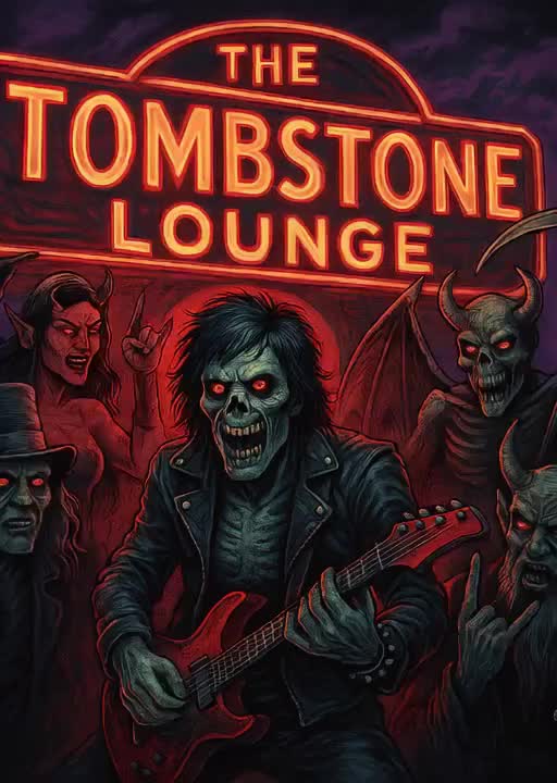 Powerful Infectious Metal, Heavy Glam Metal, Gravelly Glam Metal Singer, Melodic Rock, Live Recording, A Glam Rock Anthem that's cheesy, epic, empowering, and full of attitude, Start with a punchy, dramatic instrumental intro featuring a huge riff and gang vocals chanting 'The Tombstone Lounge!'