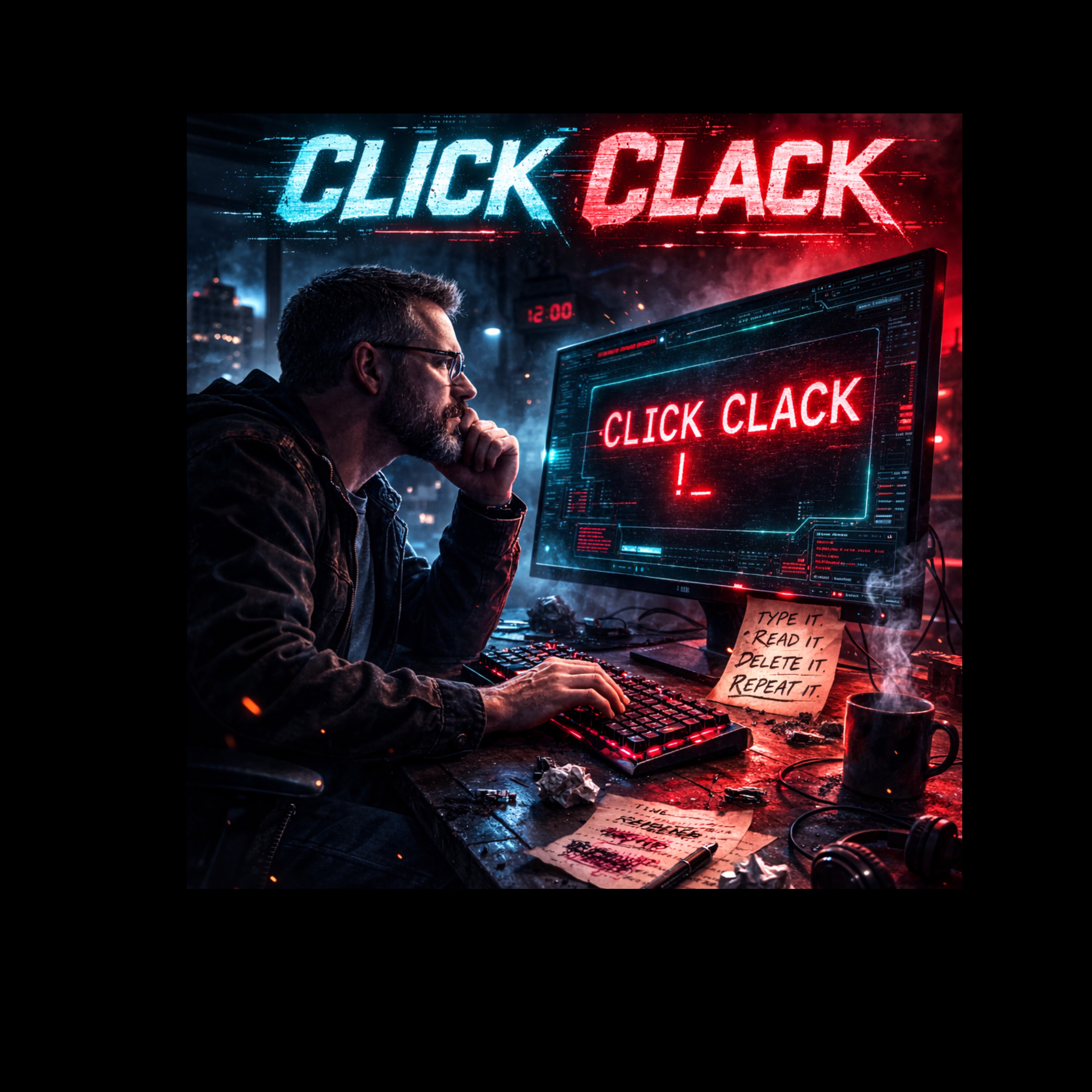 Industrial rap-rock / nu-metal driven by mechanical rhythm, 104 BPM in D minor, Intro begins with metallic typewriter clicks and ticking clock percussion forming a tight hypnotic groove, layered with glitch electronics and deep distorted synth bass, Drums punchy and groove-heavy with hip-hop influence, thick kick and cracking snare, Verses built around rhythmic spoken male vocals, aggressive and tense, riding the beat with minimal drop-tuned guitar textures and dark industrial ambience, Pre-chorus builds with tom fills, rising noise sweeps and filtered guitar distortion, Chorus explodes with heavy grunge power-chord guitars, massive drums and distorted bass, male and female duet vocals shouting and harmonizing “CLICK CLACK” with gang chant call-and-response, Sound design uses keyboard taps, metallic impacts and glitch stutters as percussion, Bridge drops to eerie ticking and whispered vocals before a huge final chorus and chaotic industrial guitar solo, non stop rhythm queen-style