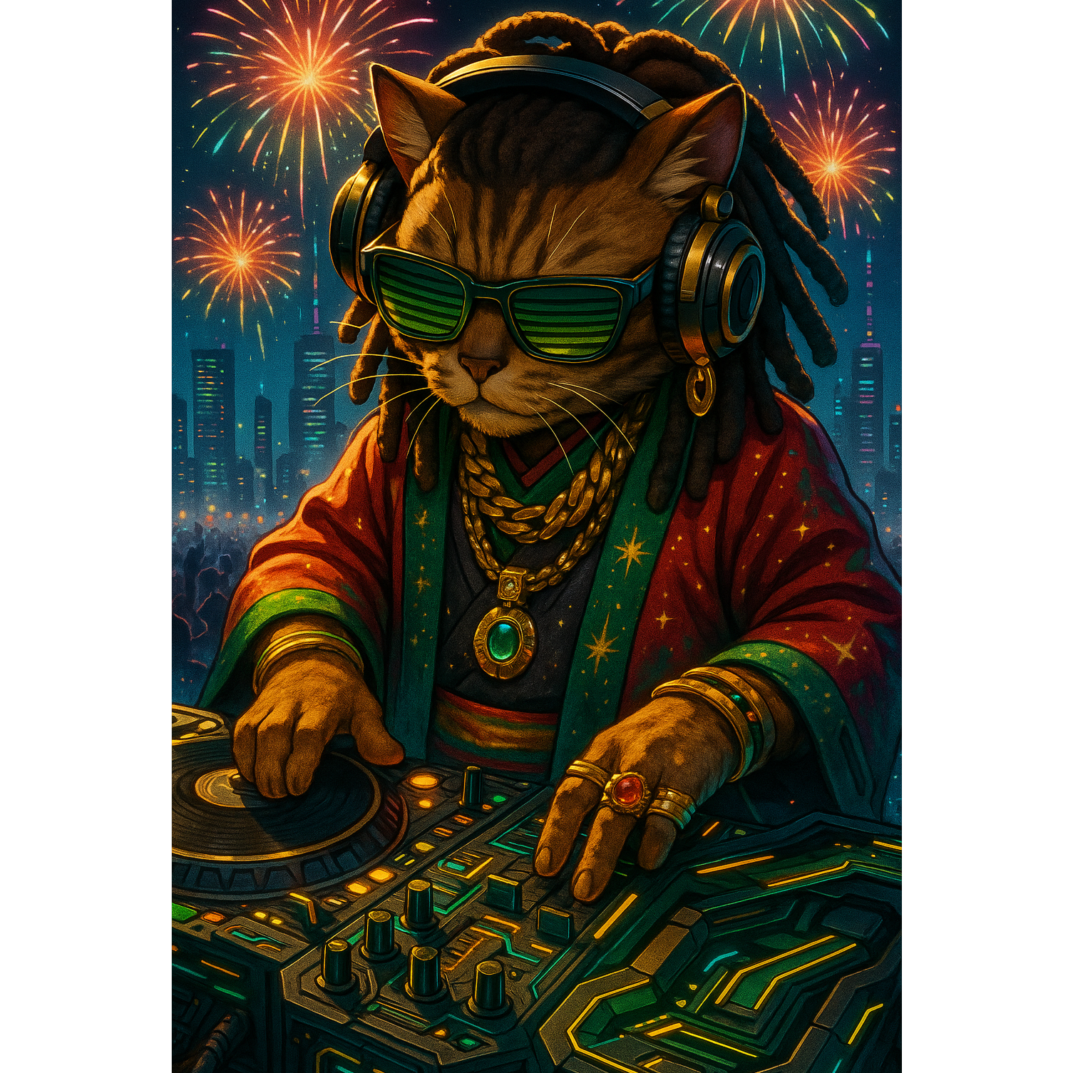2050s psychedelic heavy dub reggae, dub ska, dub disco, dub music, spooky Black Ark studio sound, Heavy Bass, Vivid, Party, Heavy tape delay and spring reverb effects, spooky dub reggae The rhythm is a mix of a one-drop reggae beat and a steady disco kick drum, echoing drums, The bass is very heavy and prominent, Everything is drenched in reverb and echo, especially the snare drum and the spooky, four-on-the-floor disco drum beat, bass and drums leading, deep melodic bassline, skanking guitar with phaser, upstroke guitar, chant-like male vocals, Include a high-pitched crying sound effect in the background, mystical, hypnotic groove, smoky, Jamaican vibes with ritualistic groove, experimental, Whimsical, No intro necessary, BPM155