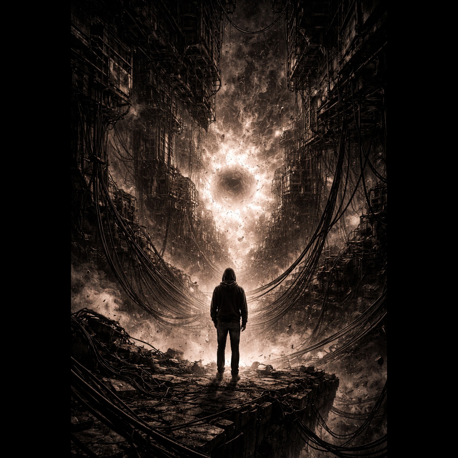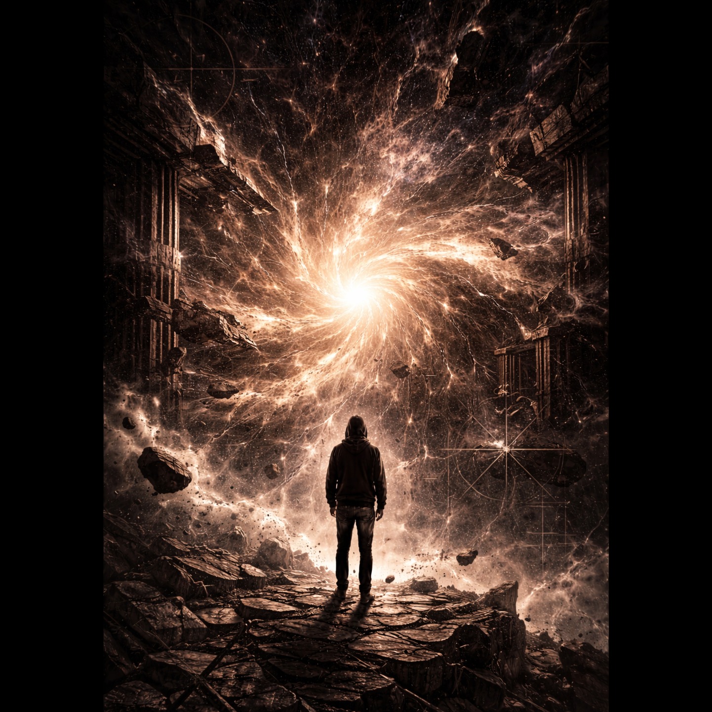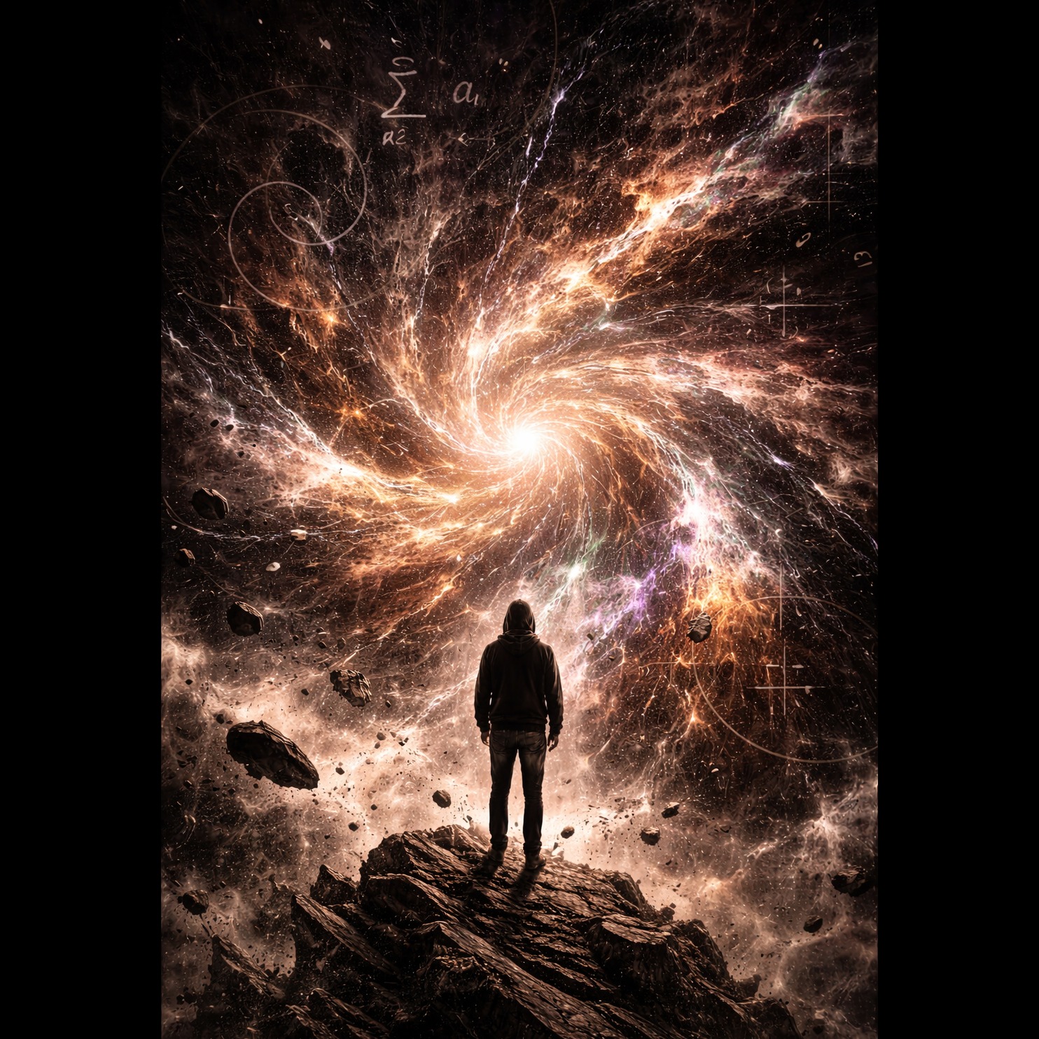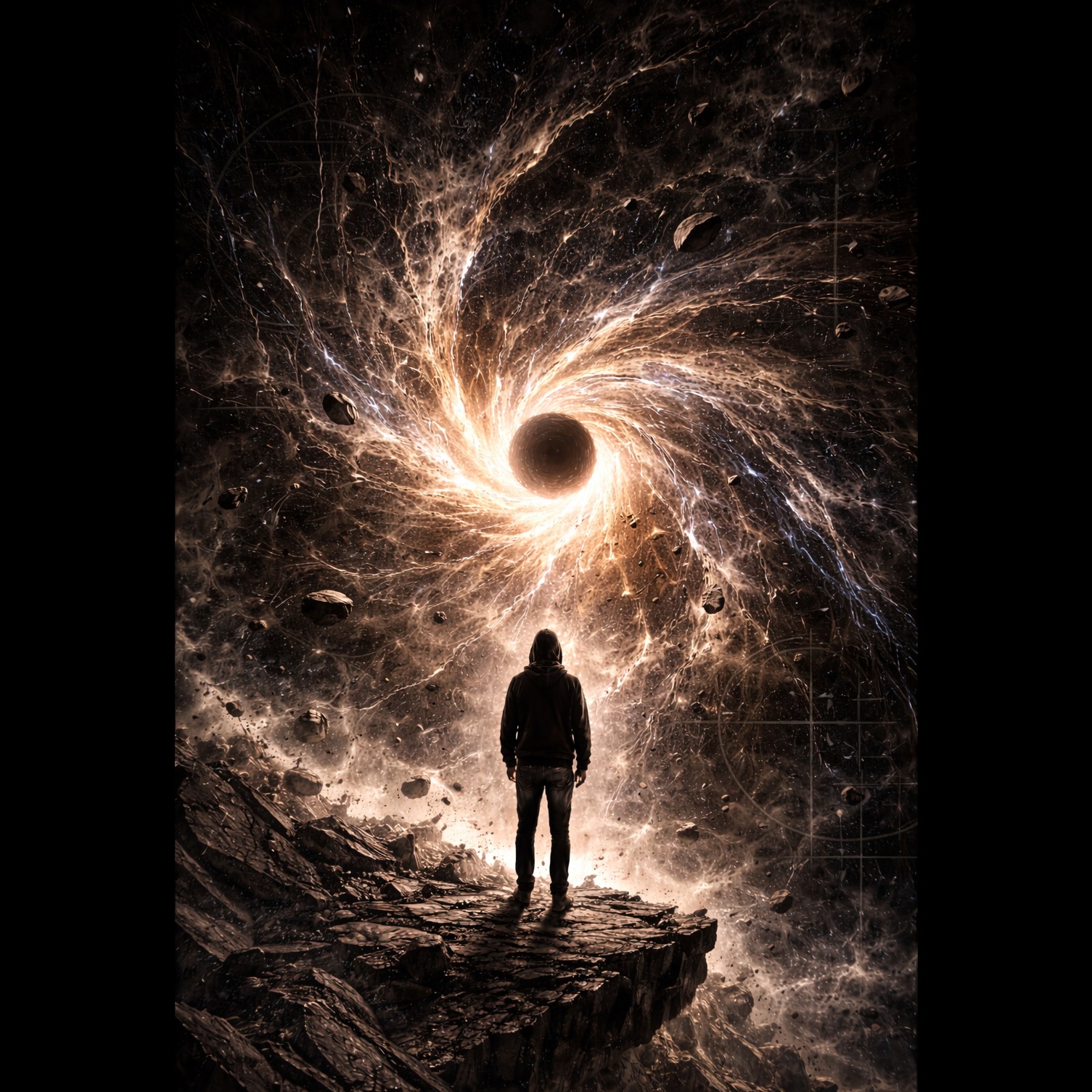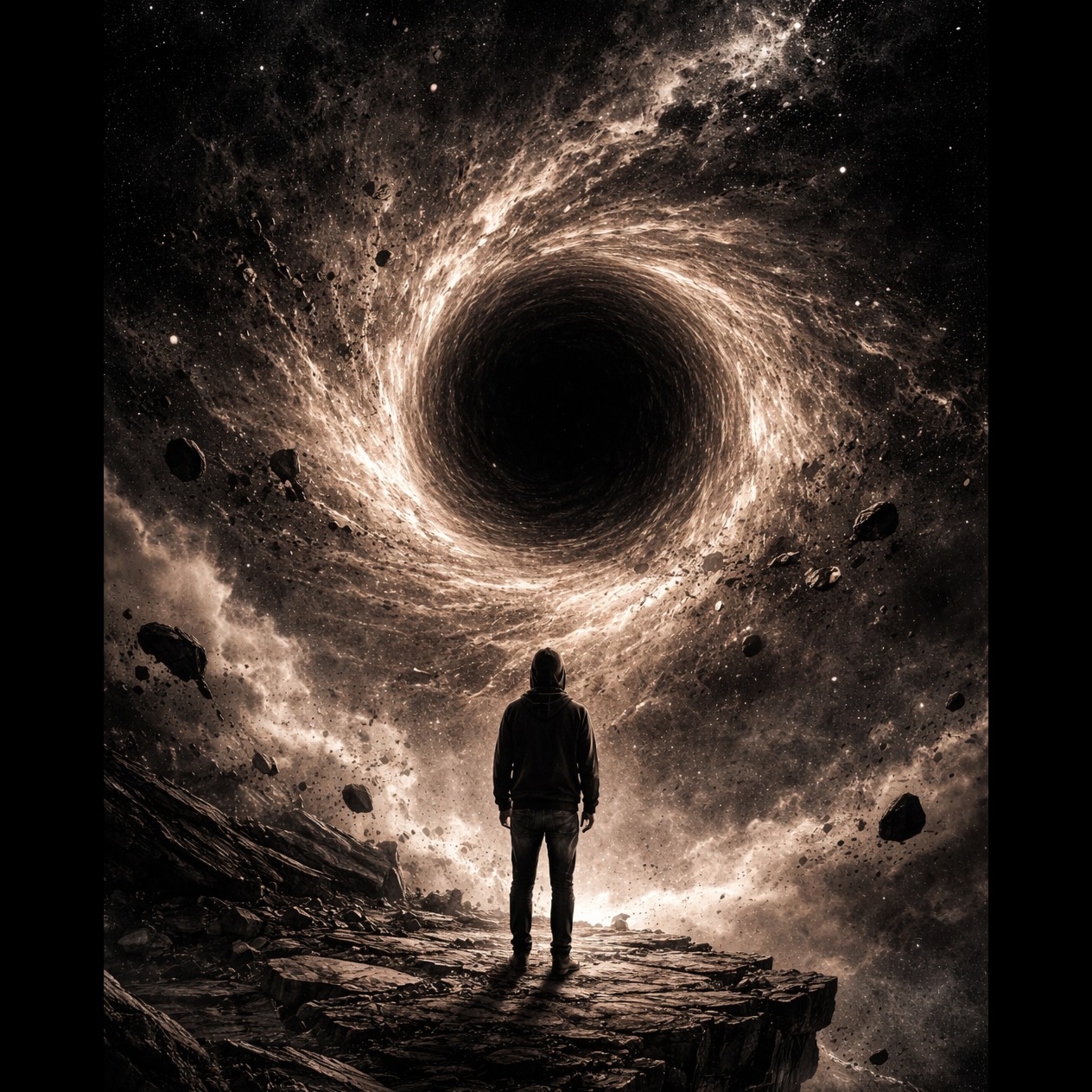 Dark ambient / psychedelic drone metal / ritual gravity, Extremely slow, heavy sub-bass, minimal structure, Sounds collapsing toward a central tone, Sparse percussion, stretched textures, massive reverb, Vocals: slow, ritualistic, fragmented, French lyrics about collapse, singularity, loss of self, Atmosphere: dense, cosmic, oppressive, Concept album, cohesive sonic identity, dark philosophical theme, emotional mathematics, abstract structure, cinematic continuity