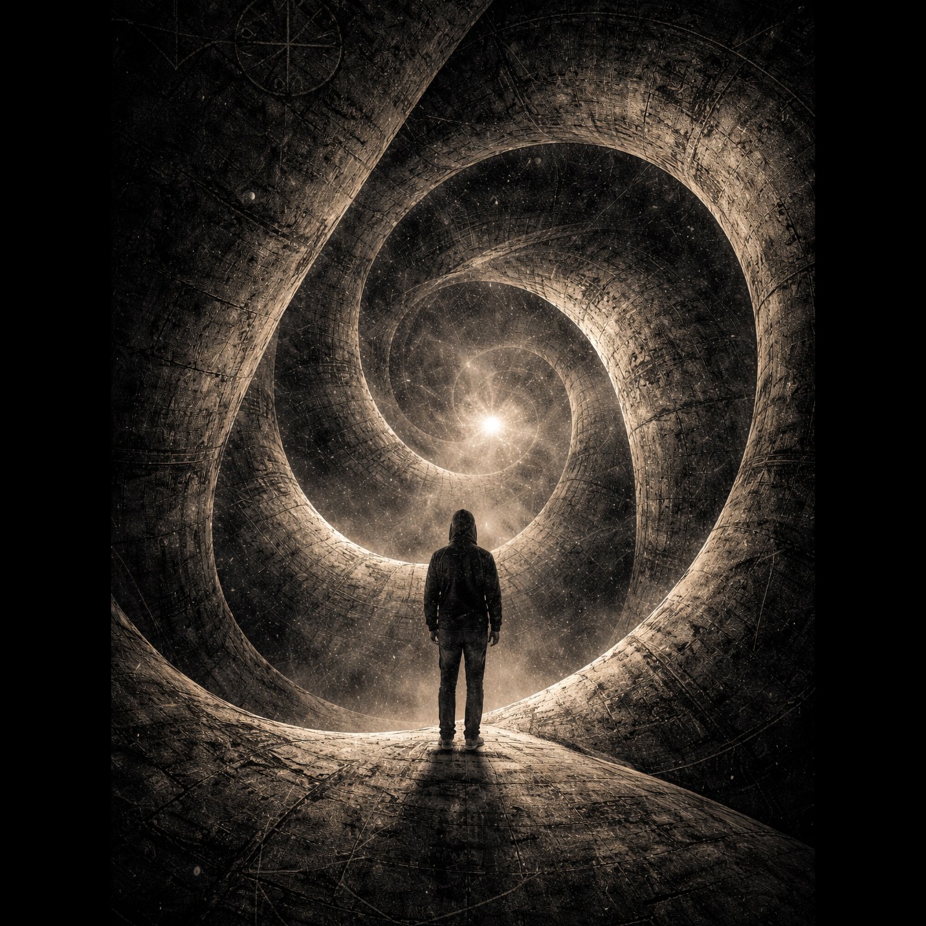 Experimental psychedelic metal / ambient space / industrial ritual, Heavy, slow riffs with varying pitch, irregular rhythm, shifting structure, Deep, resonant toms, metallic percussion, Sonic distortions: filters, pitch modulation, spatial distortion, No stable direction, Vocals: Detached, introspective, slightly doubled baritone voice (Uther), French lyrics evoking enclosed spaces, the absence of escape, a transformation without recourse, Atmosphere: disorienting, confined, elastic space, Concept album, coherent sonic identity, dark philosophical theme, emotional mathematics, abstract structure, cinematic continuity