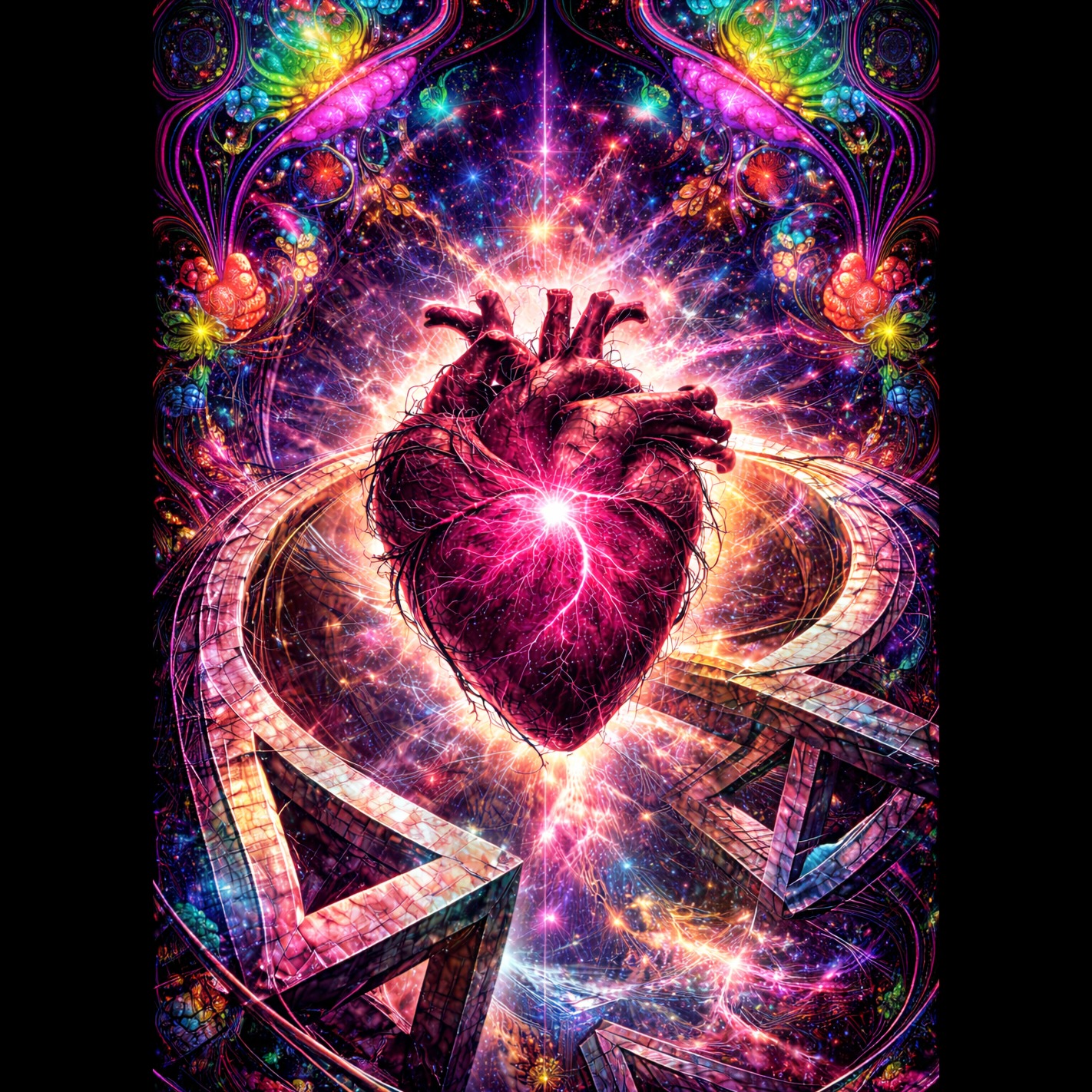 Psychedelic rock / spatial ambient / emotional ritual, Fluid structure, meandering melodies, distorted guitar tones, shifting harmonies, Gentle tribal percussion, evolving ambient textures, Male vocalist with a deep, theatrical baritone voice; the verses are whispered, intimate, and hypnotic, almost spoken, with drawn-out syllables and an unsettling calm, The chorus explodes into a raw, distorted, unstable, emotional, and slightly deranged scream, far removed from the typical metal scream, The vocals are decadent, haunting, seductive, and menacing, like a fallen preacher or a broken ritual leader, French lyrics evoking a distorted space and perception-altering love, Atmosphere: emotional, fluid, disorienting, yet intimate, concept album, cohesive sonic identity, dark philosophical theme, emotional mathematics, abstract structure, cinematic continuity
