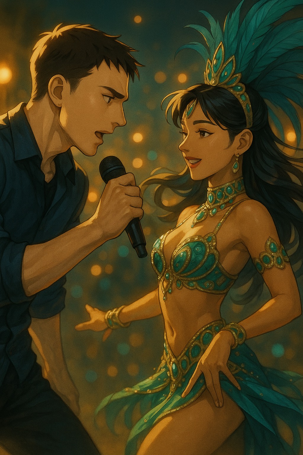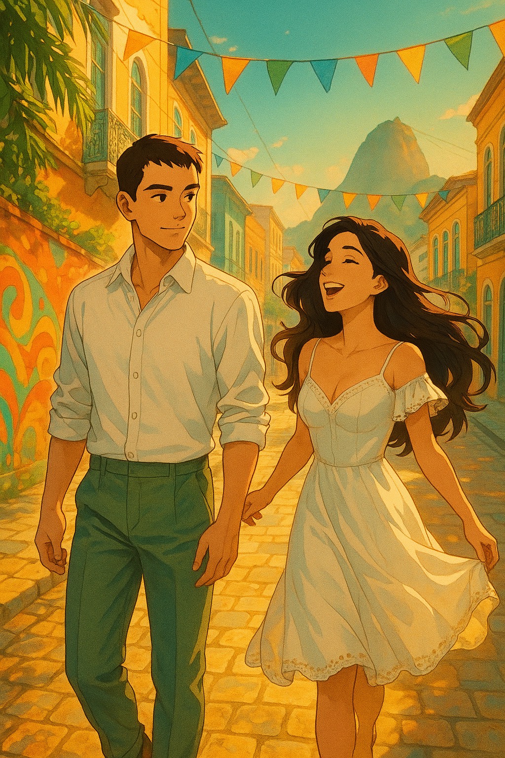 Starts on a live beatbox loop → surdo + 808 blend, Cavaquinho sparkles above a bass that slides smooth and melodic, Drums tight, percussion human-warm, horn stabs clean and syncopated, Vocals clear, close, believable — micro-reverb gives intimacy, Tommy = confident wit, syllabic precision, sly warmth, Líria = radiant control, velvet fire, effortless dominance, Mix polish: stereo percussion width • horns side-panned • vocal bus + 1, 5 dB lift at 6 kHz • master lightly glued at -10 LUFS, Mood = Measured Joy • Magnetism • Recognition • Playful Restraint • Rio Night Glow