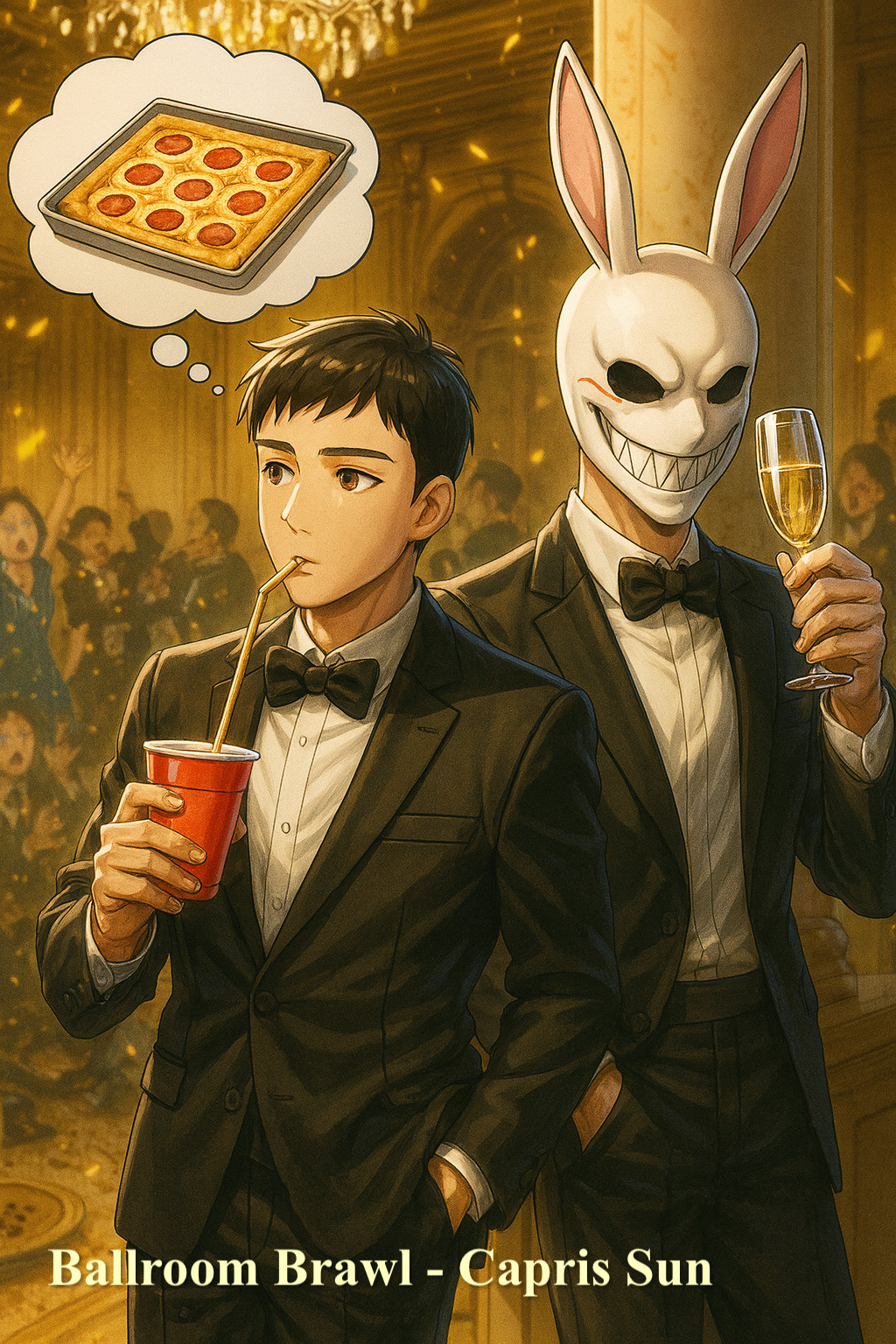 - [Male 1] – Hyper-articulate storyteller with precise breath control and multi-syllabic flow, Pure rap cadence, no melody, Speech-rhythmic delivery; sarcasm flips to technical precision, - [Male 2] – High-energy commentator; animated, reactive, half-laughing tone, Pure rhythmic emphasis, quick breaths, raised pitch, comic ad-libs (whoa / yo / he wildin), Mood: black-tie bedlam with cinematic humor