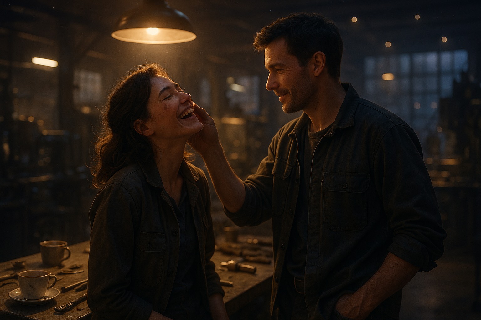 Intent: A machine with a heartbeat — melancholy under fluorescent romance; work becomes worship, hum becomes harmony