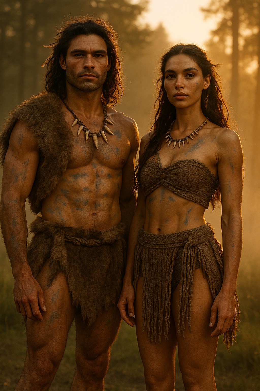 Genre: Proto-funk tribal fusion, BPM 90, Mood: swagger + survival = style, Percussion: chest-thump drums at 80 Hz, bone clacks, and proto-beatboxing (pfk-tsk-hu-drh) with swing ±12 ms, Vocals: Lei (f) = open vowels + chorus 10%; Gronk (m) = low growls + sub resonance 60 Hz; offset ±0, 3 s for stereo breath, Atmosphere: wind drone 40–400 Hz, insect pans, fire spark 2–3 kHz, flute fifths panned ±60°, Mix arc: 0:00–0:45 mono birth → 1:40 groove build → 2:15 full swagger → 3:05 communion → 3:42 silence, Master EQ: +2 dB low warmth, +3 dB air lift at 2:50 peak (LUFS ≈ -10), Sound world intent: prehistoric couture runway in a breathing biosphere—earth struts because it survived