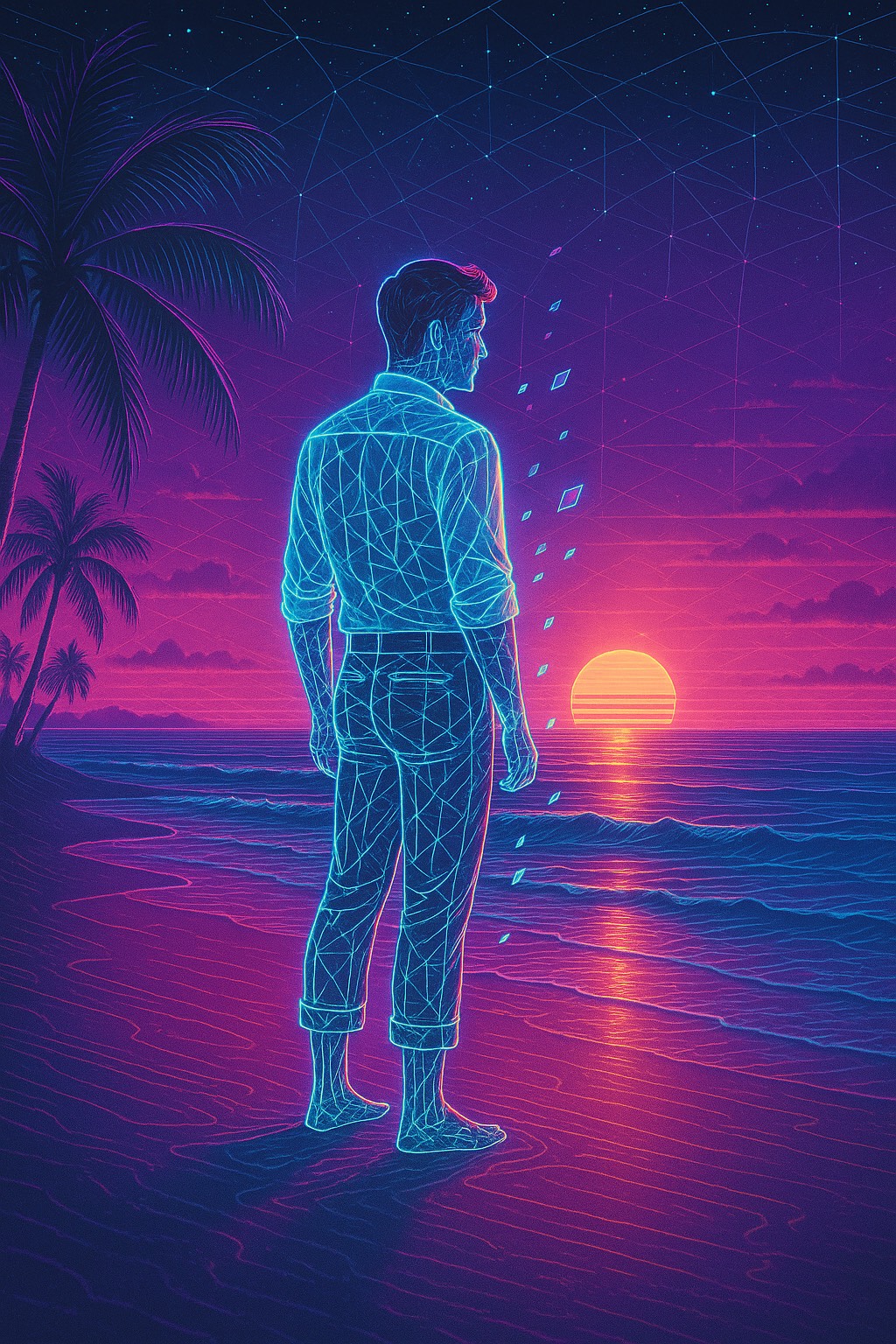 chillwave × indie-synth-pop × dream-melancholy; sun-bleached pads breathing with sidechain warmth; soft 707-style drums with gentle gated reverb; watery DX7 bells with chorus/delay shimmer; coastal haze mids (~1–2, 5k) for nostalgic glow; bass round + plucky (85–110 Hz pocket); wide stereo palm-shadow pads; light tape-warp drift (<1% wow/flutter); breathy close-mic vocal (2 dB presence lift), distant harmonies washed in plate reverb; humid analog warmth; emotional physics: sunlight behaves like memory, waves behave like regret; no lo-fi grit, keep clean but hazy