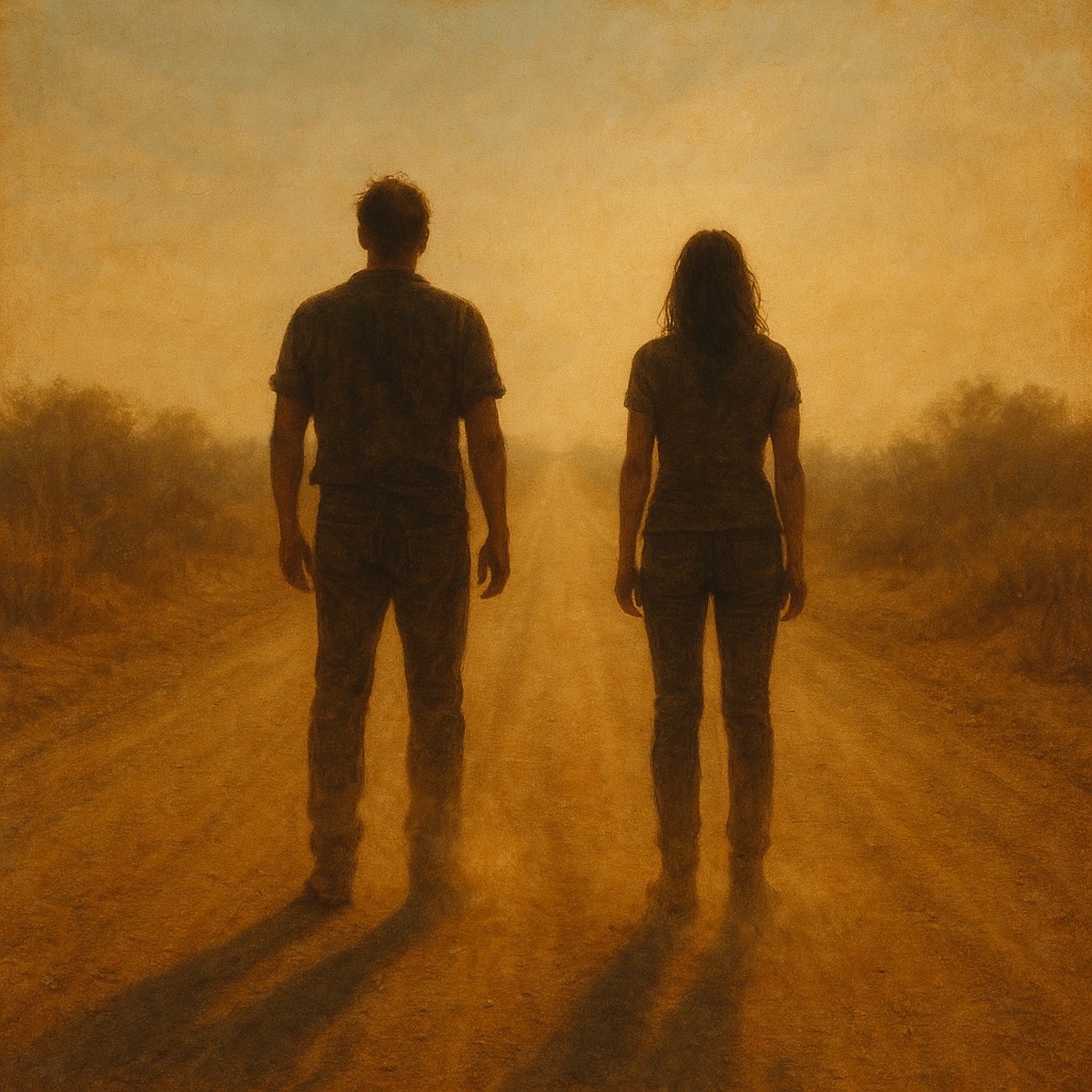 – Elias (Male Baritone): Weathered, low, gravel-warm, half-sung drawl, intimate and calm under strain, – June (Female Alto): Smoky, soulful, resilient tone; able to mirror or shadow Elias naturally, Vocals may alternate, trade phrases, or harmonize freely; every line is written so either voice—or both—can claim it, Arc = Dust → Drought → Voice → Rain • Theme = Shared Faith and Love Through Endurance • Mood = Weary Hope That Turns to Grace