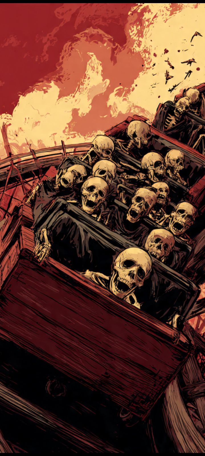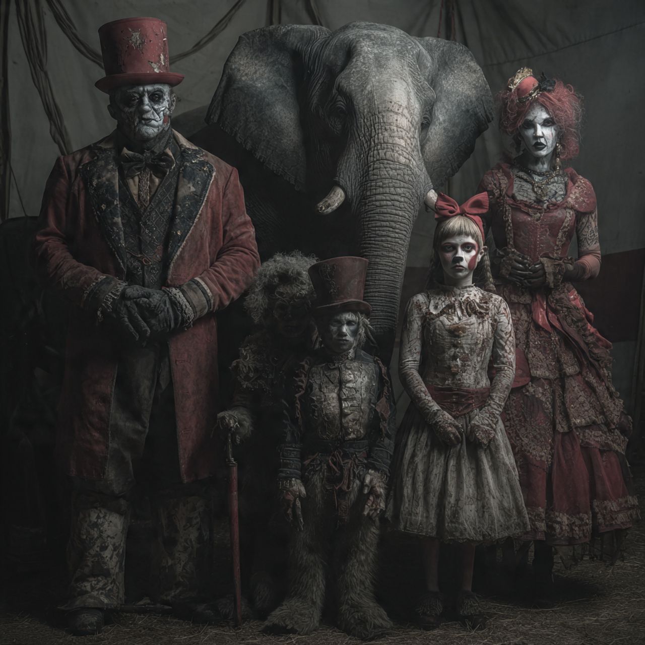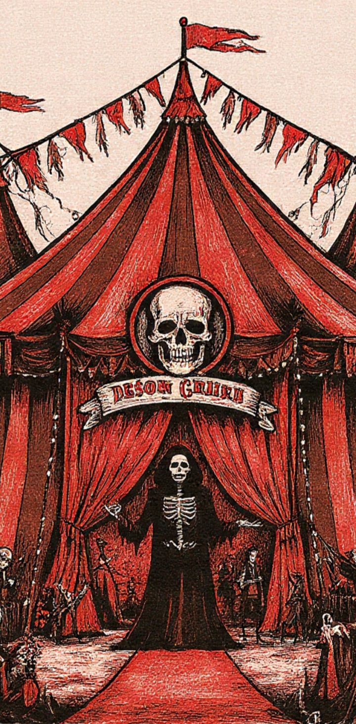 90's Brutal Death Metal, 2000's Slamming Death Metal, Death Metal, Symphonic Black Metal, Lead and Rythym Guitars, Guitars Down tuned, Tremolo picking, Palm Mutes, Pinch Harmonics, Reverb, Deep Death Growling Vocals, Reverb, Relentless Double Bass, Relentless Blast beats, Brutal Death Metal, Keyboards, Synths, Big Top Ambiance, Psychotic Circus Ambiance, Death, Terror, Dread, Horror, Childs Music Box, Chainsaws, Screams, Laughter, Horror Sound Effects