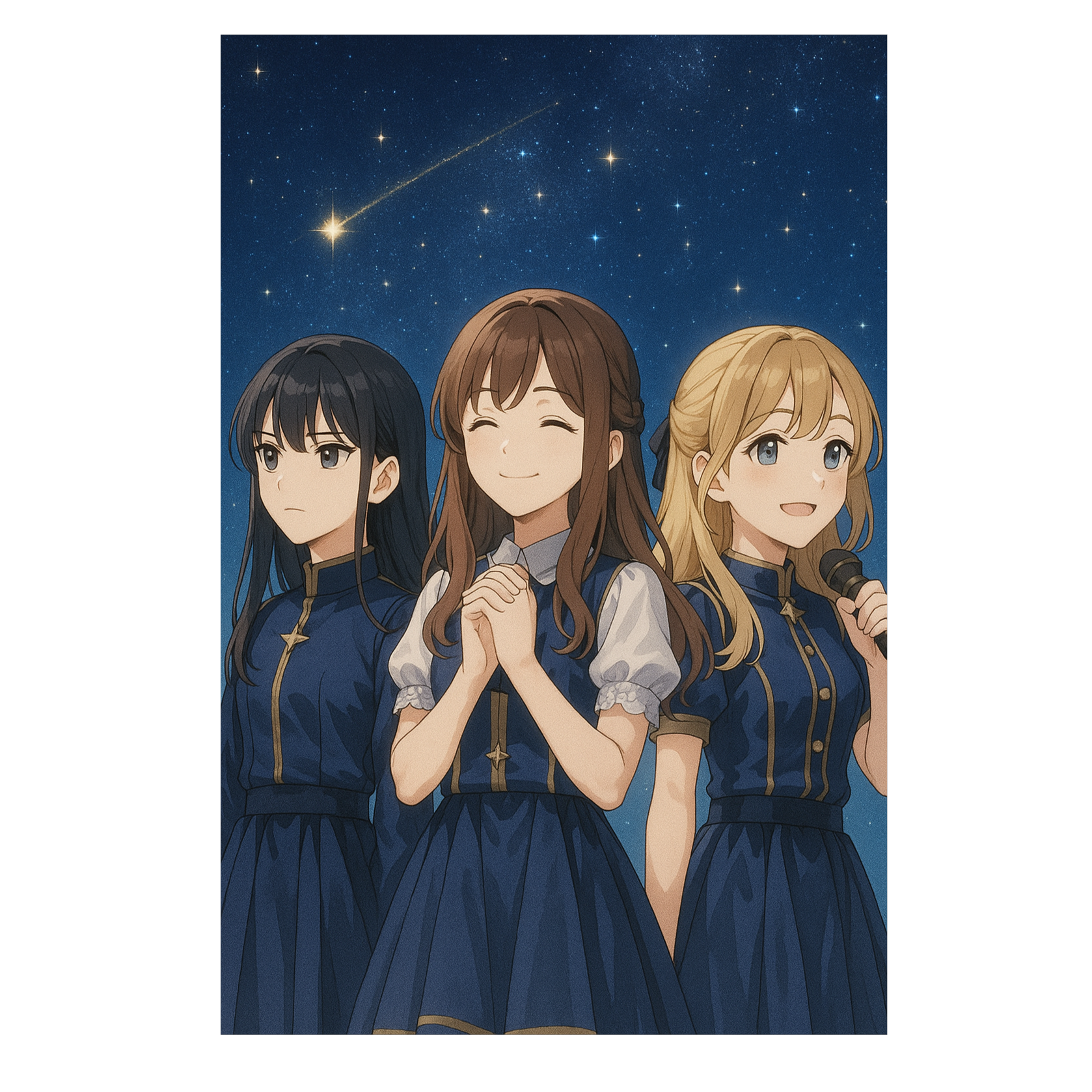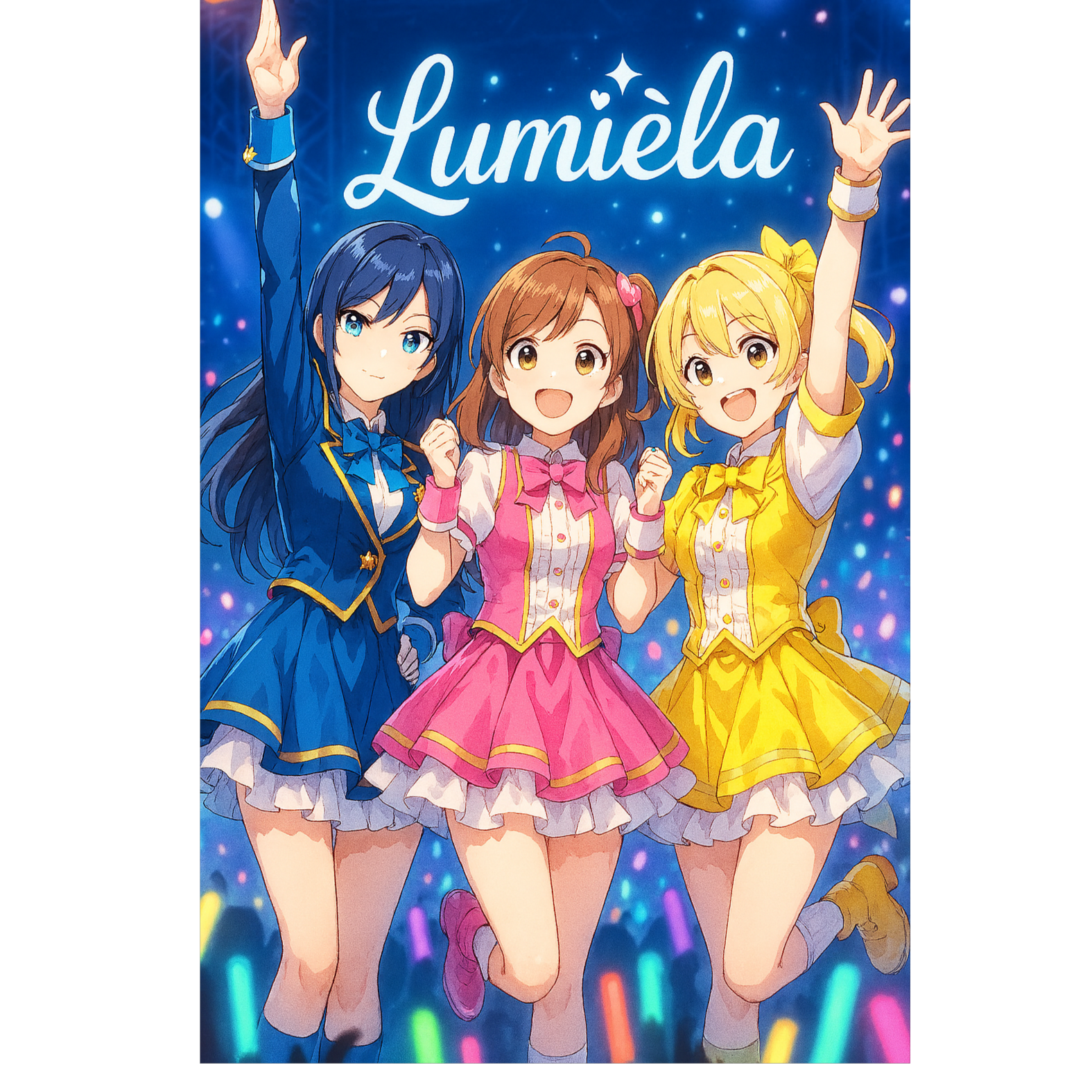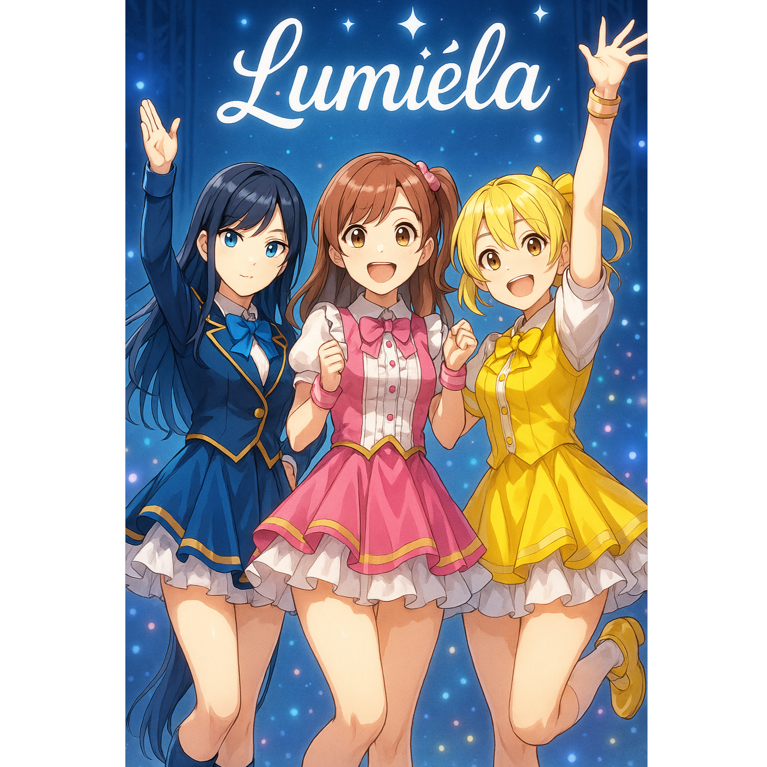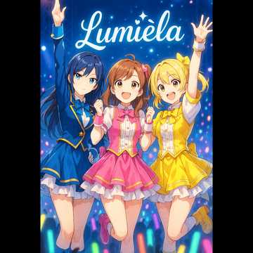 Girl Group, Japanese Idol Pop, Bright Synthpop, Upbeat Tempo, Sparkling Melodies, Cheerful and Harmonized Female Vocals, Kawaii Energy, 3-Vocal Ensemble, Lush Chorus Layers, Danceable Rhythm, Shiny Stage Vibes, Symphonic, High Quality Sound