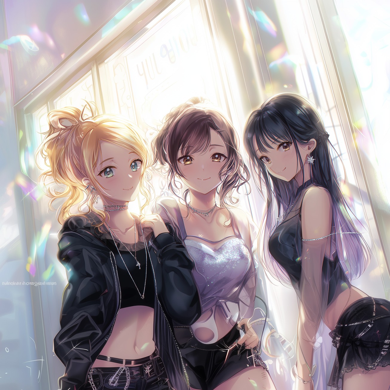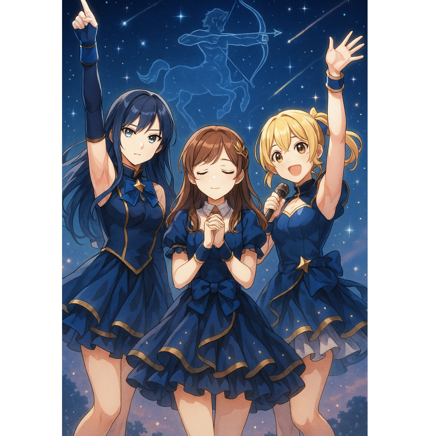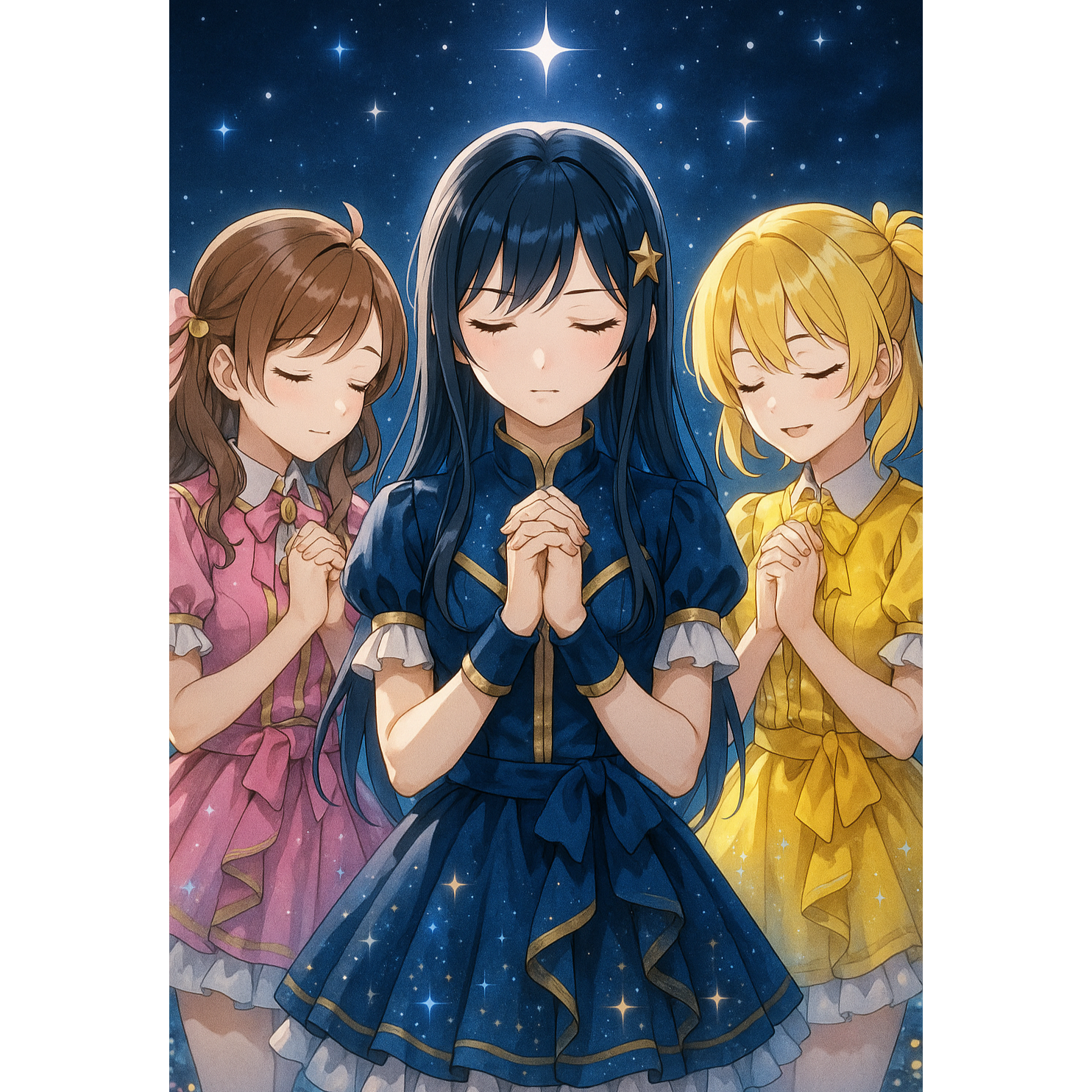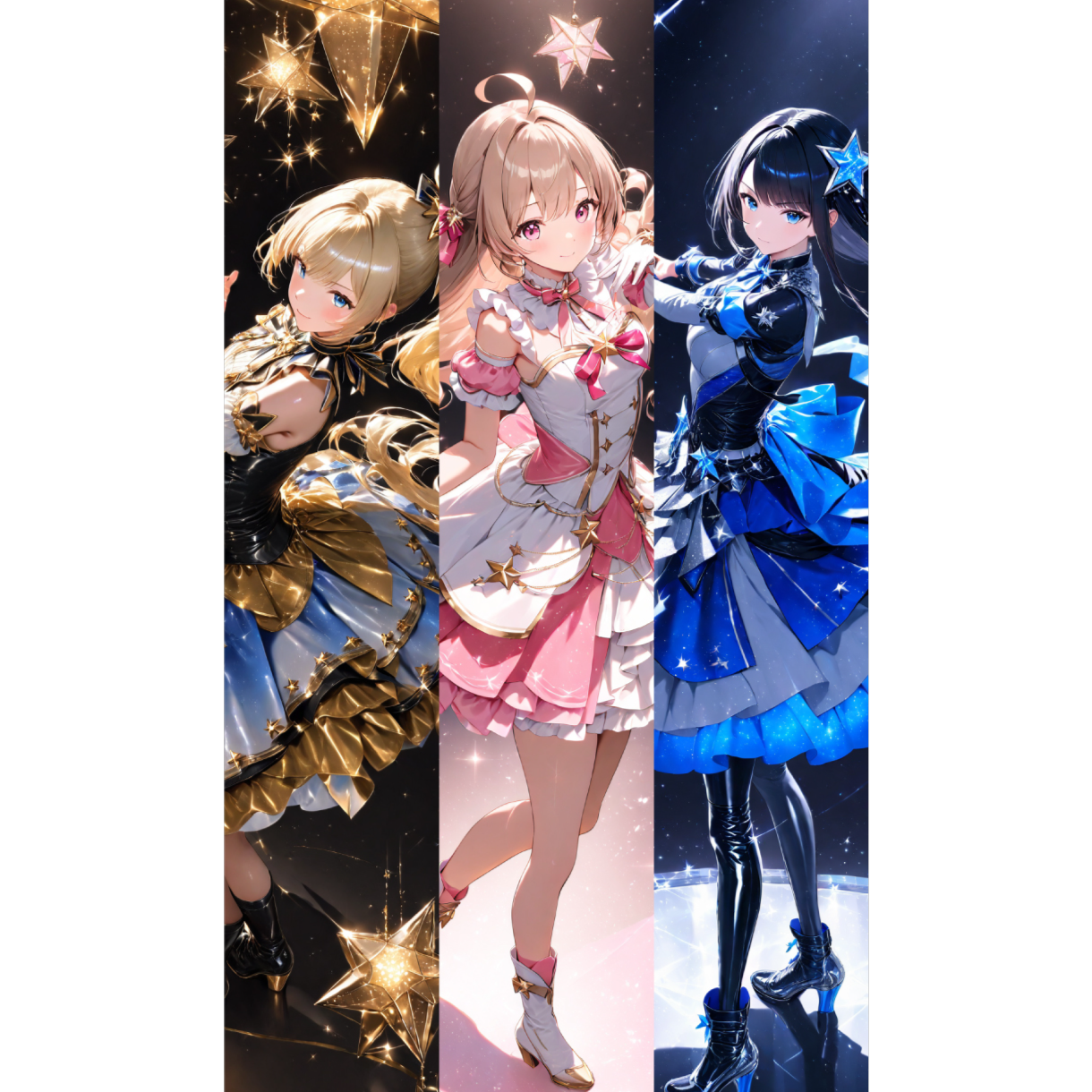 Girl Group, Japanese Idol Pop, Bright Synthpop, Upbeat Tempo, Sparkling Melodies, Cheerful and Harmonized Female Vocals, Kawaii Energy, 3-Vocal Ensemble, Lush Chorus Layers, Danceable Rhythm, Shiny Stage Vibes, Symphonic, High Quality Sound