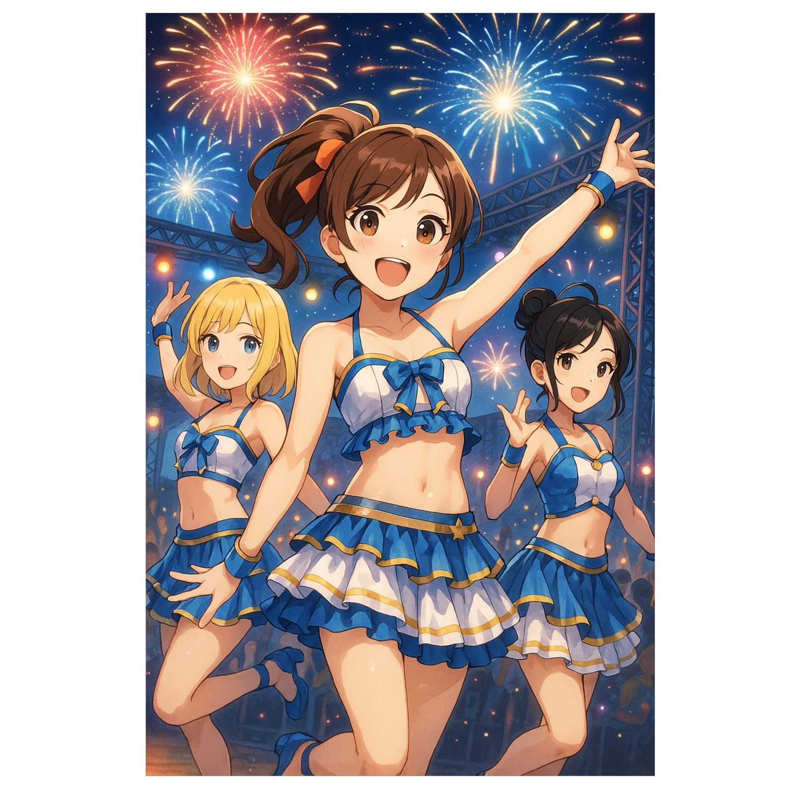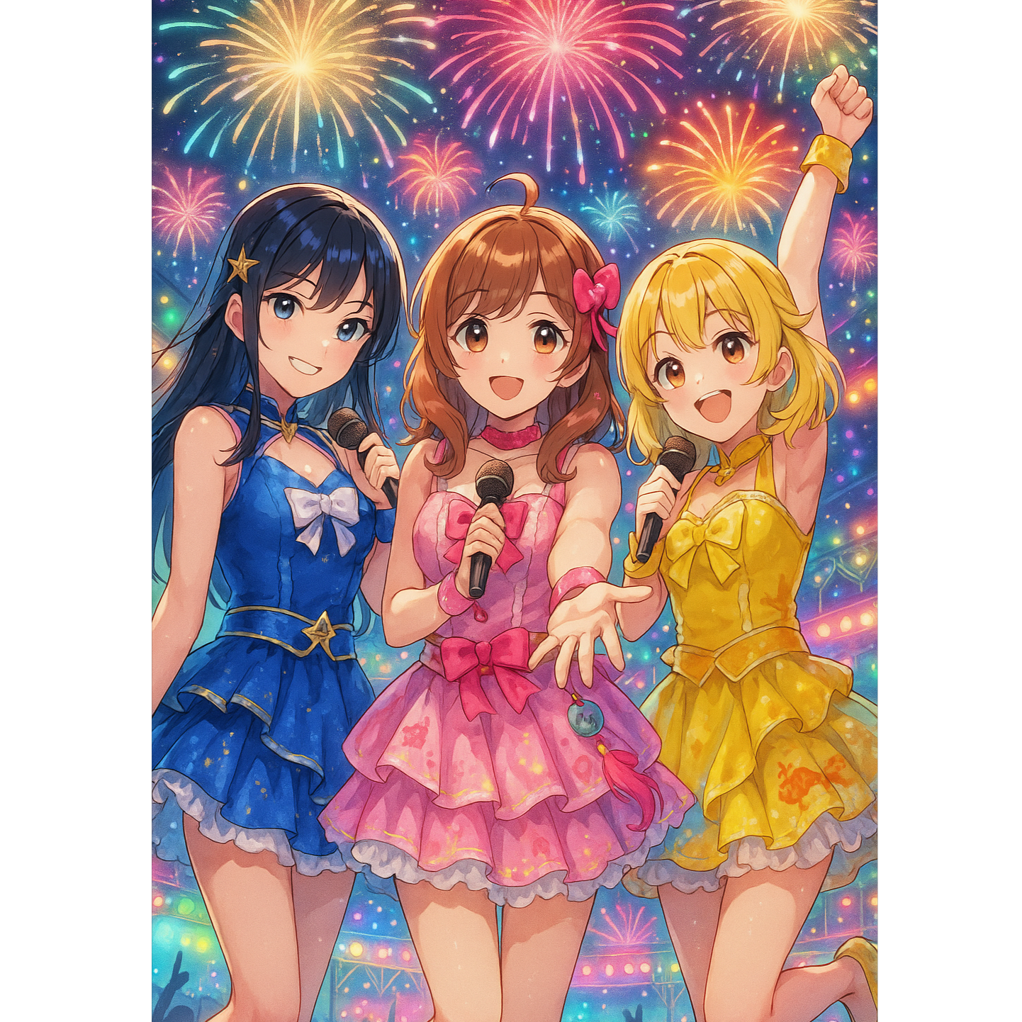 Japanese Idol Pop, Summer Festival Dance, Sparkling EDM, Bright and Explosive Sound, Upbeat Synth Beats, Fireworks and Festival Energy, High BPM, Emotional Build-ups and Beat Drops, 3-Vocal Girl Group with Call & Response, Festival Chants, High-Quality Club Mix, Heavy Bass, Anthemic