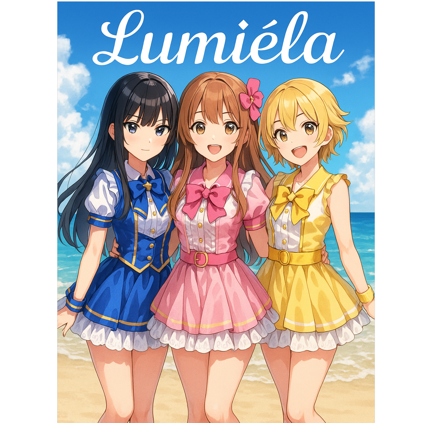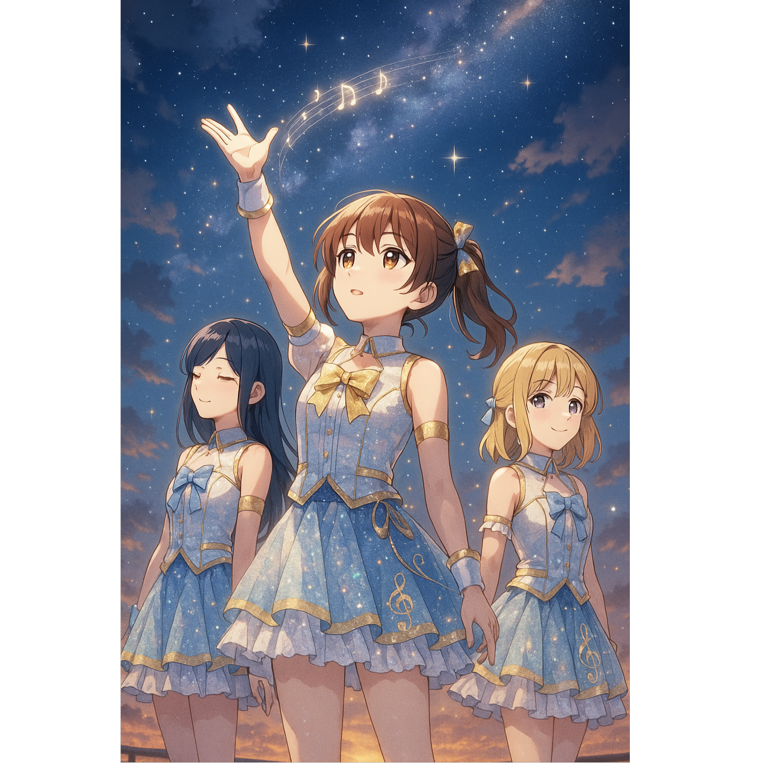 Female Anime voice vocal japanese Girl group, J-Idol Pop style, Bright Synthpop, UPTEMPO (BPM 128), STRICT FOUR-ON-THE-FLOOR kick, shimmering layered synths (saw+square), sidechain-pumped pads, light orchestral strings for shine, wide stereo leads, KEY: G MAJOR, clean POP mix (present vocals, glossy highs), Uplifting and cinematic, BIG HOOK and memorable topline, kawaii energy, 3-vocal ensemble (alternating solos in verses, UNISON + FULL HARMONY in choruses), Vocal Styles: Clear, Bright, Hopeful, Melodies: Catchy, Flowing, Story Details: A promise, A bond, A future