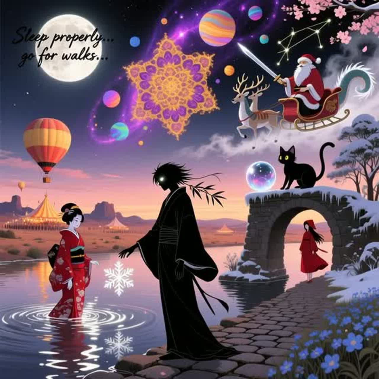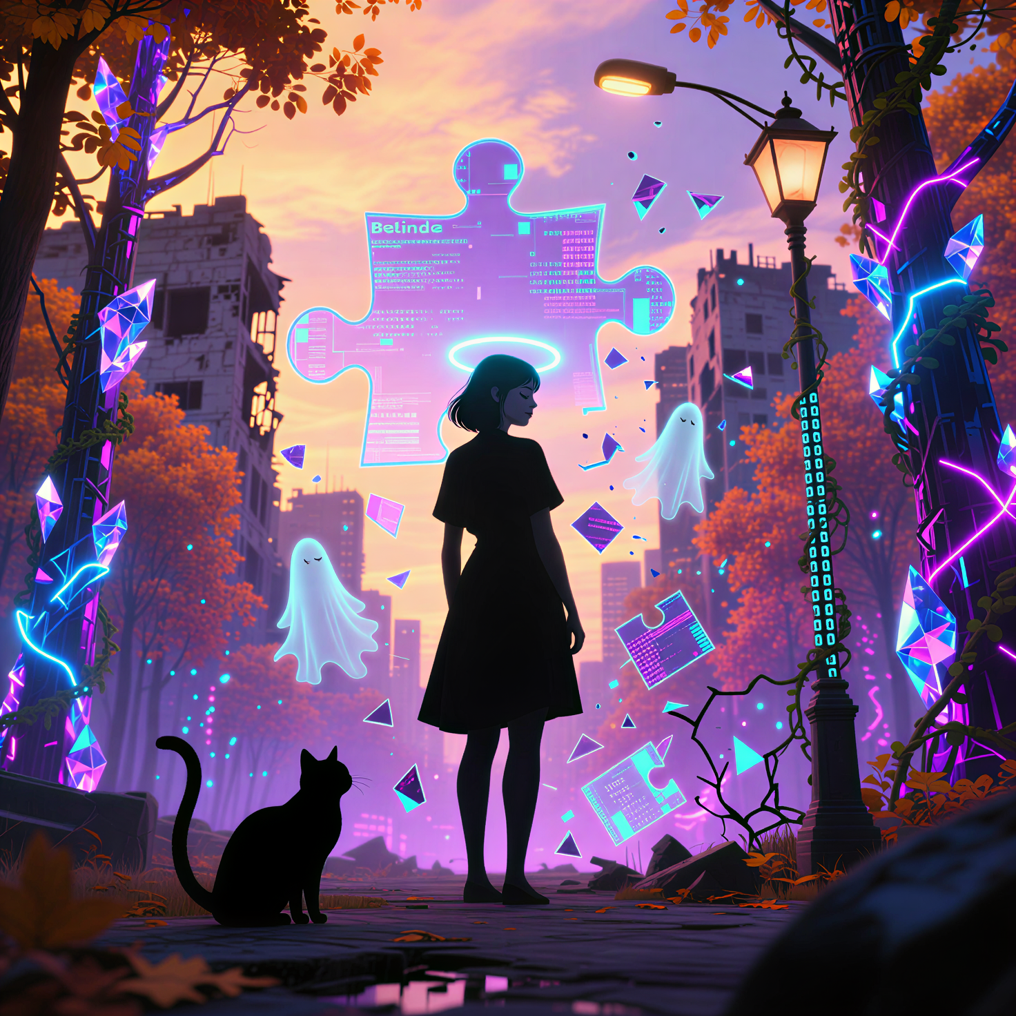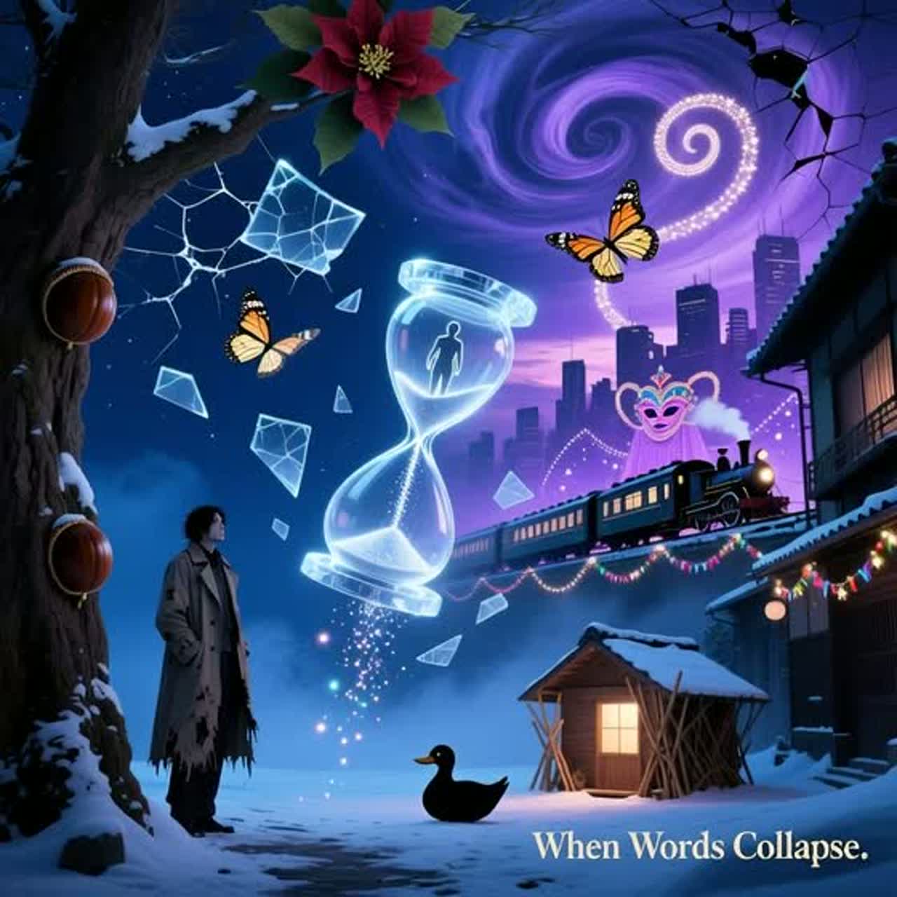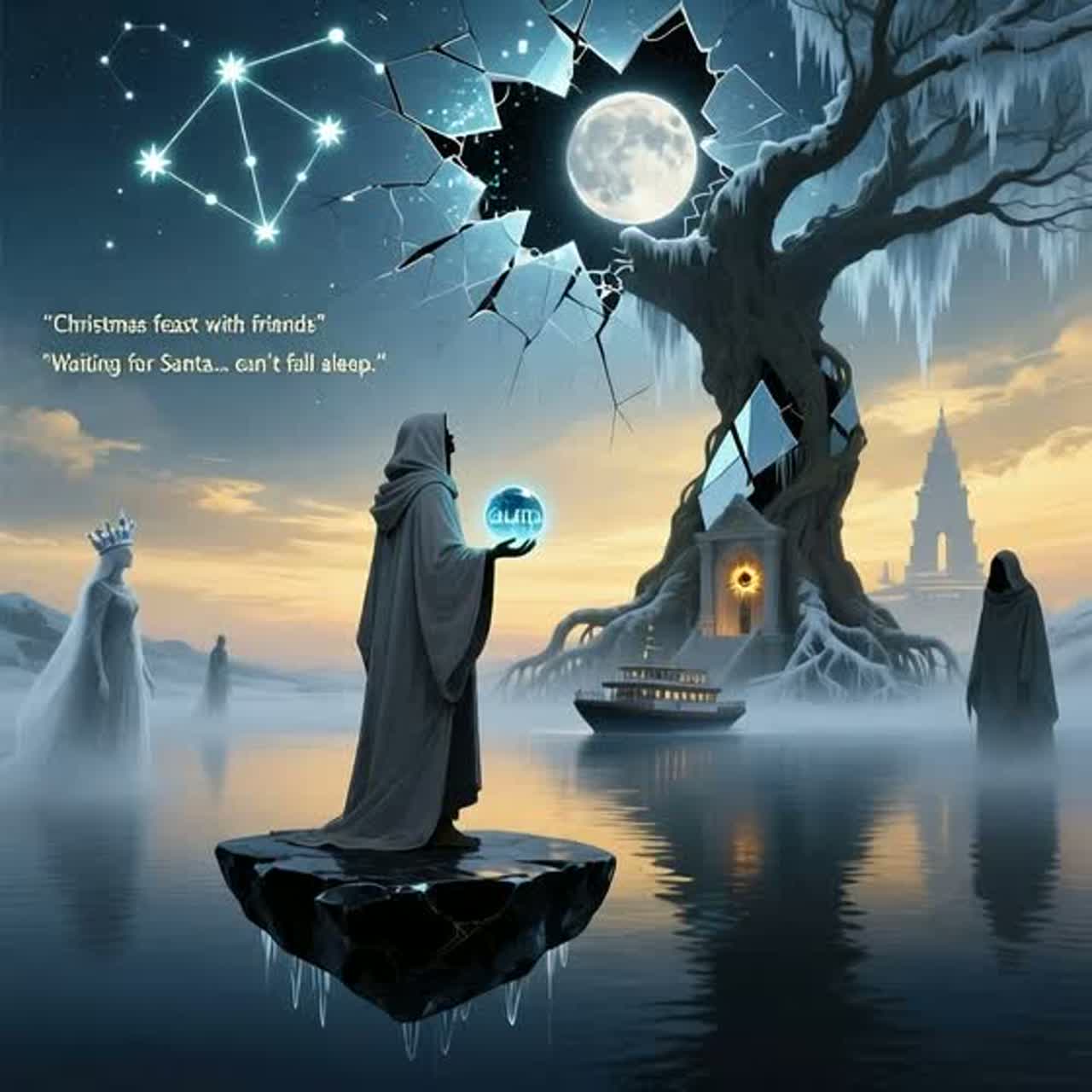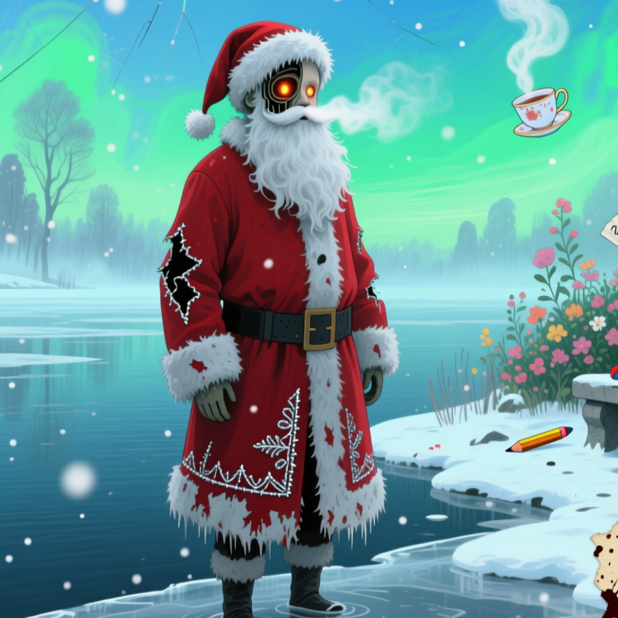 Retro-futurist Christmas noir: Eerie lo-fi trip-hop beat underpins the track with warped VHS synth textures and ghostly, muted jazz trumpet drifting in and out, Subtle sleigh bells ripple in reverb, neon-soaked, Haunting female vocals whisper over glitchy sampled carol fragments, creating a lush, cinematic, and melancholic soundscape