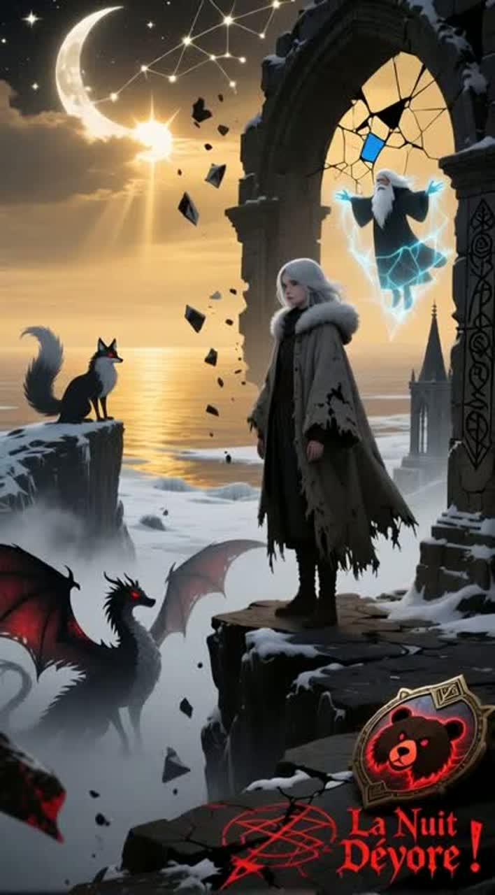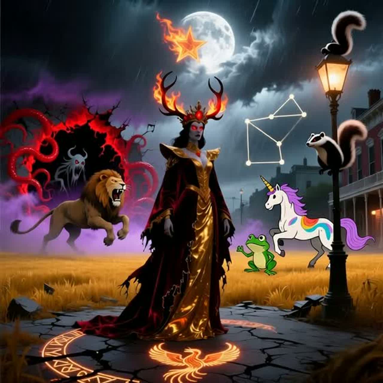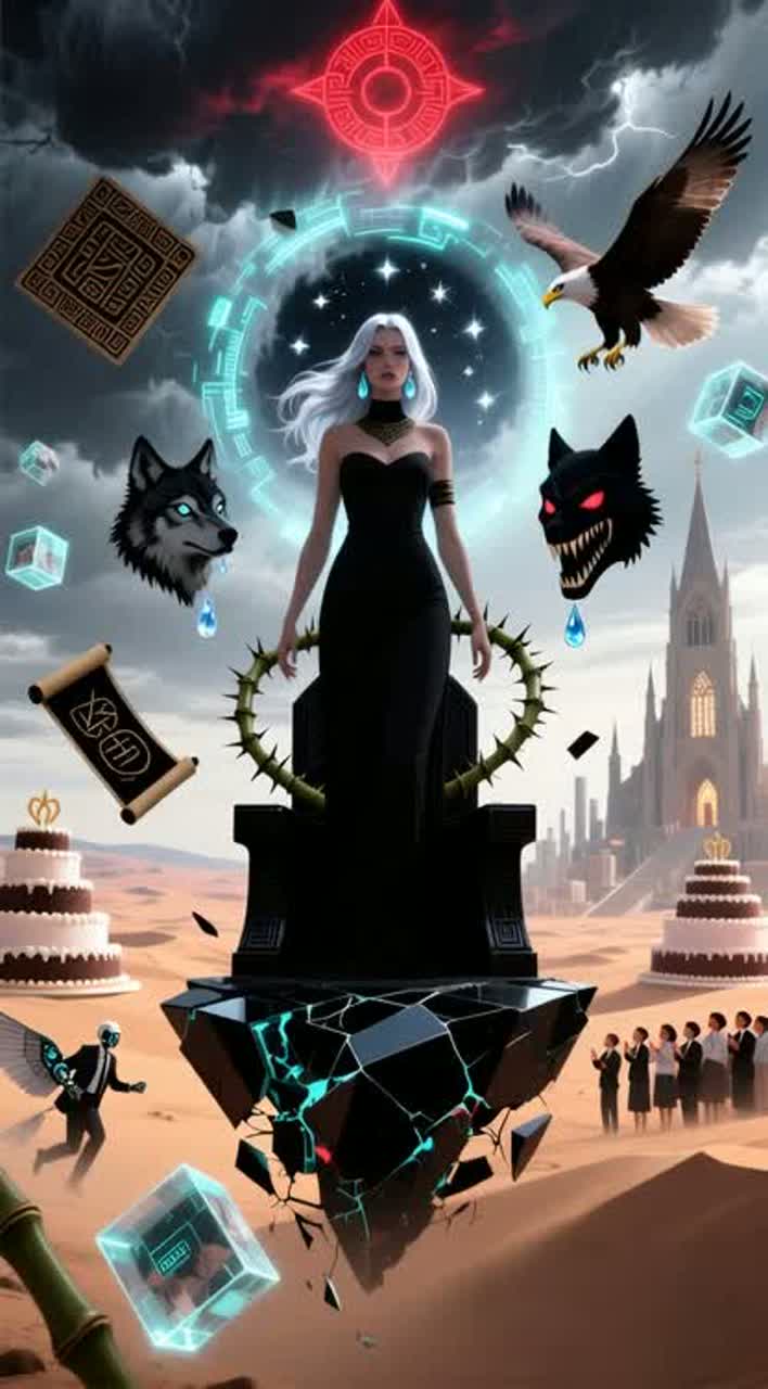 This symphonic black metal track erupts with rapid double bass, epic orchestral strings, and crushing distorted guitars on power chords and melodic leads, Verses pair operatic female vocals with male growls, layer in choir and brass, while the chorus unleashes harmonized vocals, sweeping strings, and massive rhythm, A mid-song bridge features a virtuoso guitar solo propelled by pulsing synth arpeggio, The crisp, wide mix fuses punchy drums, clear heavy guitars, lush orchestration, and subtle electronics for a modern edge, Relentless tempo and intensity drive the track throughout