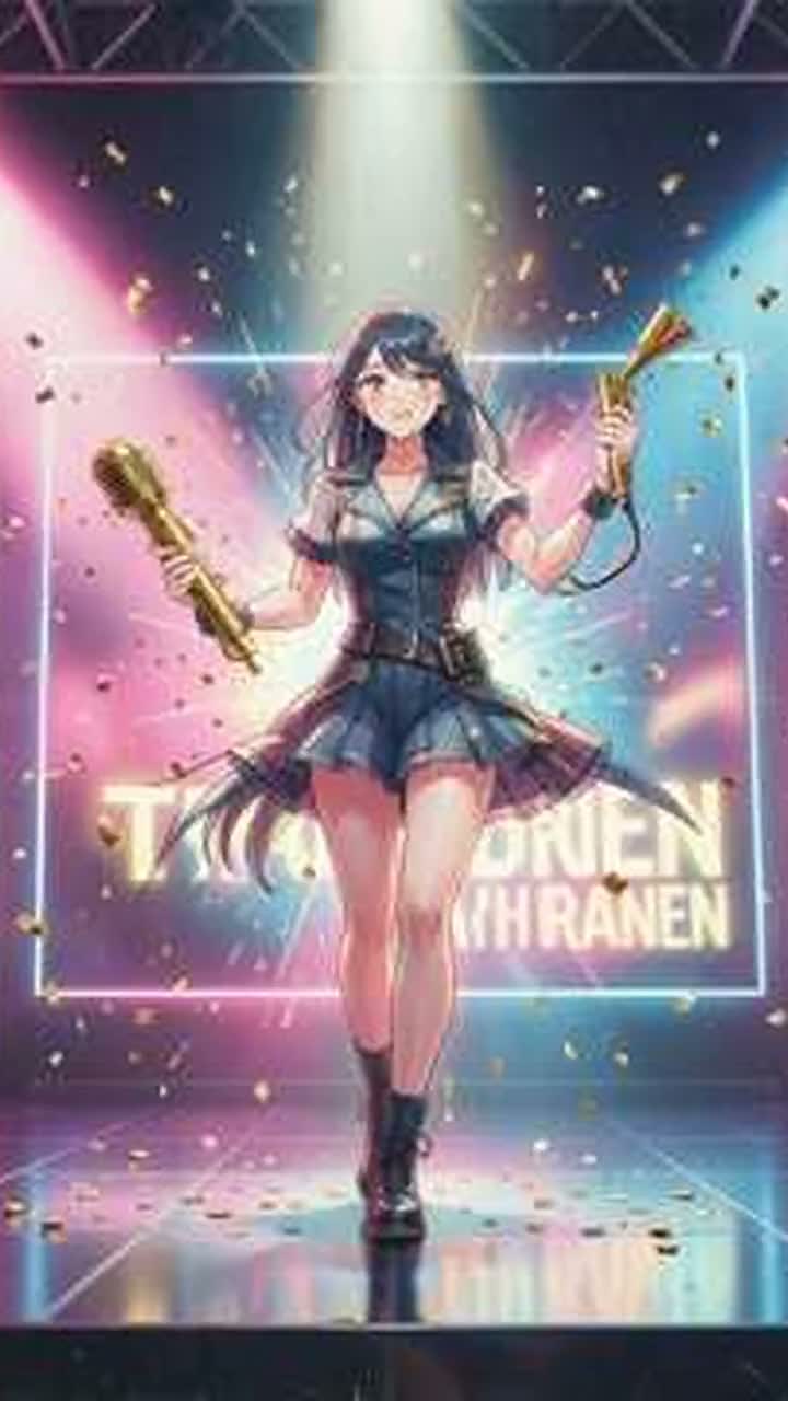 J-pop, Idol rock, Girl group, Fast tempo, 175 BPM, Heavy electric guitars, High-pitched female vocals, Anime opening style, High energy, Aggressive, Punk pop, Shouted backing vocals, Orchestral strings accents, Dramatic, Revenge theme