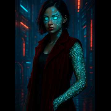 Synth Driven, Cyberpunk, Experimental, Heavy, Melodic Synth, Electronic, Catchy Beats, Simple Spanish Female Vocals