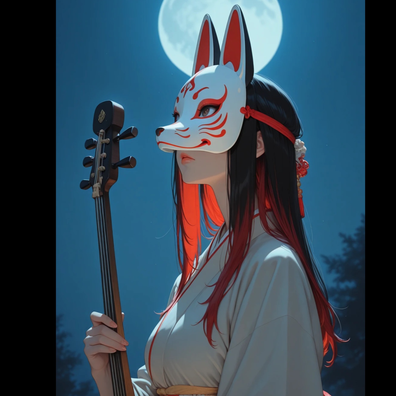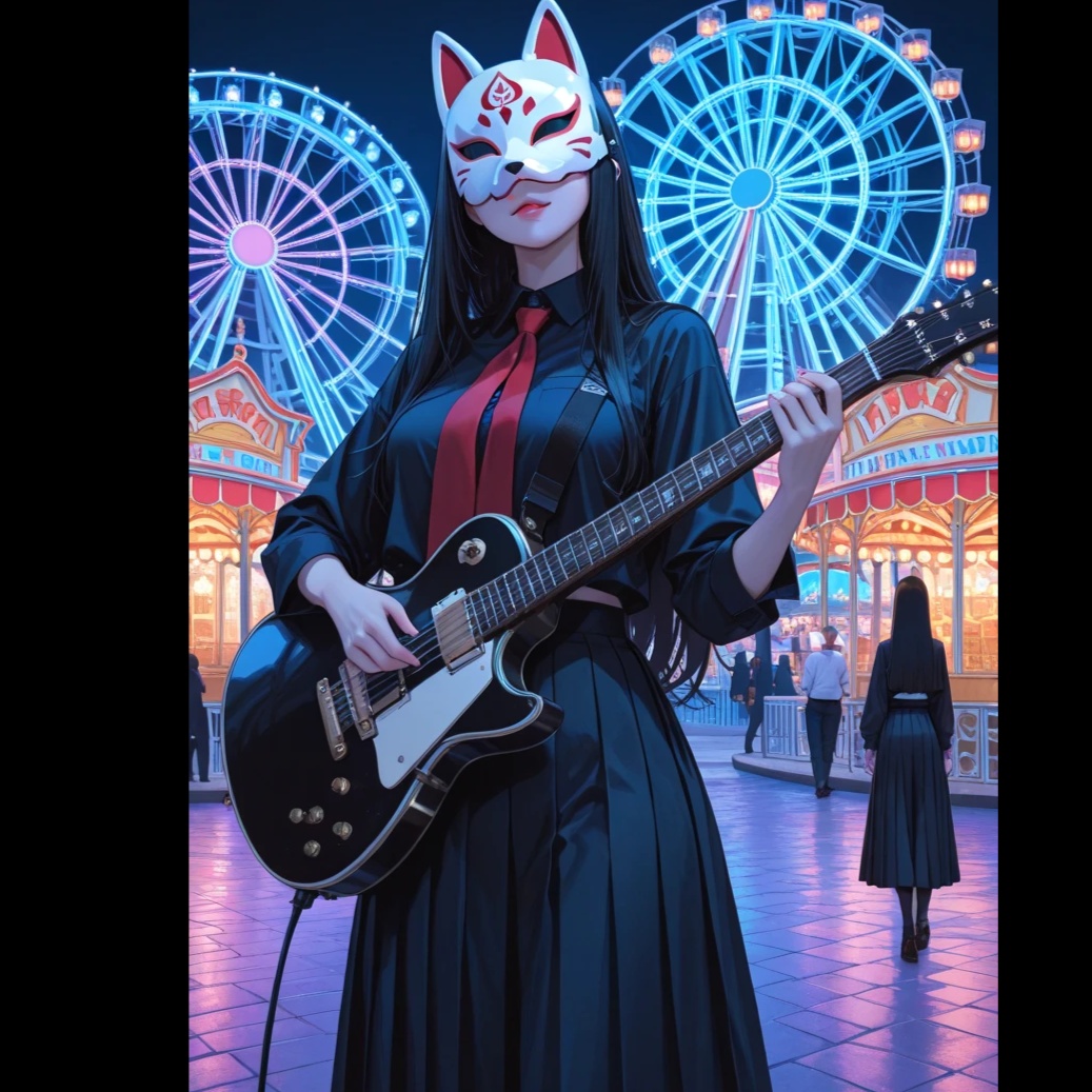 Dark and mysterious Japanese rock song with female vocals, Features shamisen and koto as the main instruments, Heavy electric guitar and pounding drums blend with traditional Japanese melodies, Emotional and powerful chorus, Japanese lyrics, Enigmatic, melancholic atmosphere with modern rock intensity