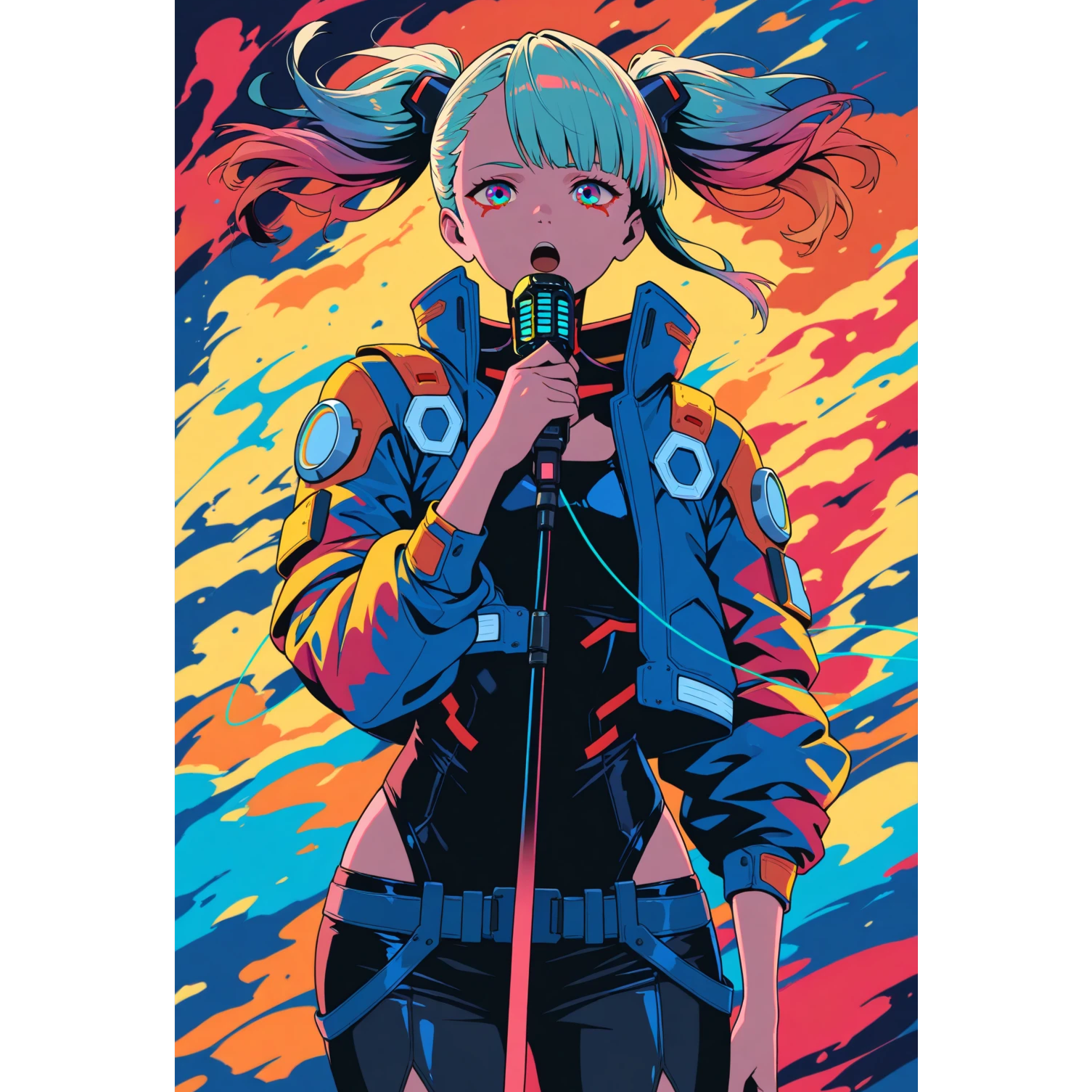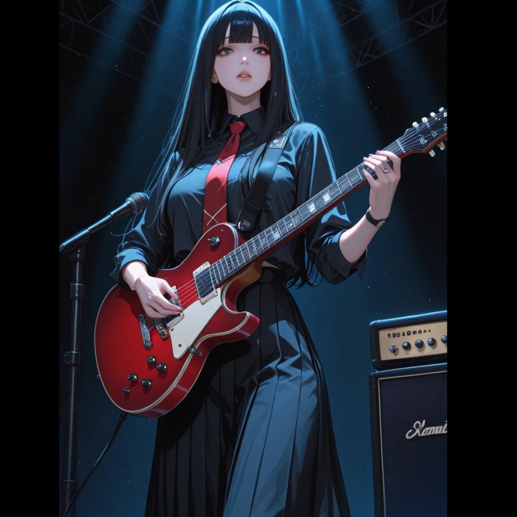 A fast-paced Japanese rock song with powerful twin electric guitars and harmonized solos, Featuring a high-pitched, energetic female vocalist singing passionately in Japanese, The music is intense and emotional, with rapid double bass drumming and dramatic chord progressions, Perfect for an anime battle scene, The sound is bold, fierce, and adrenaline-pumping