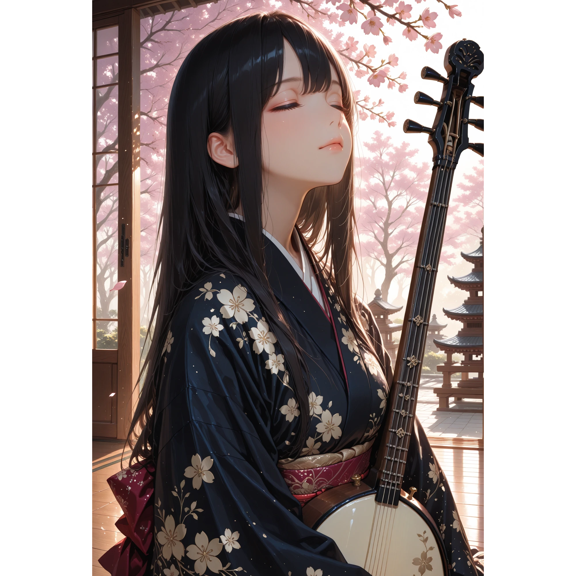 Japanese-style metal rock with a strong, melodic female vocal (no shouting), Prominent shamisen and koto throughout, Starts with a dramatic shamisen and koto intro, then builds into heavy guitars and double bass drums, Midsection features an instrumental break with shamisen and percussion, Theme: elegant, intense, and emotional, inspired by the beauty and strength of a legendary oiran